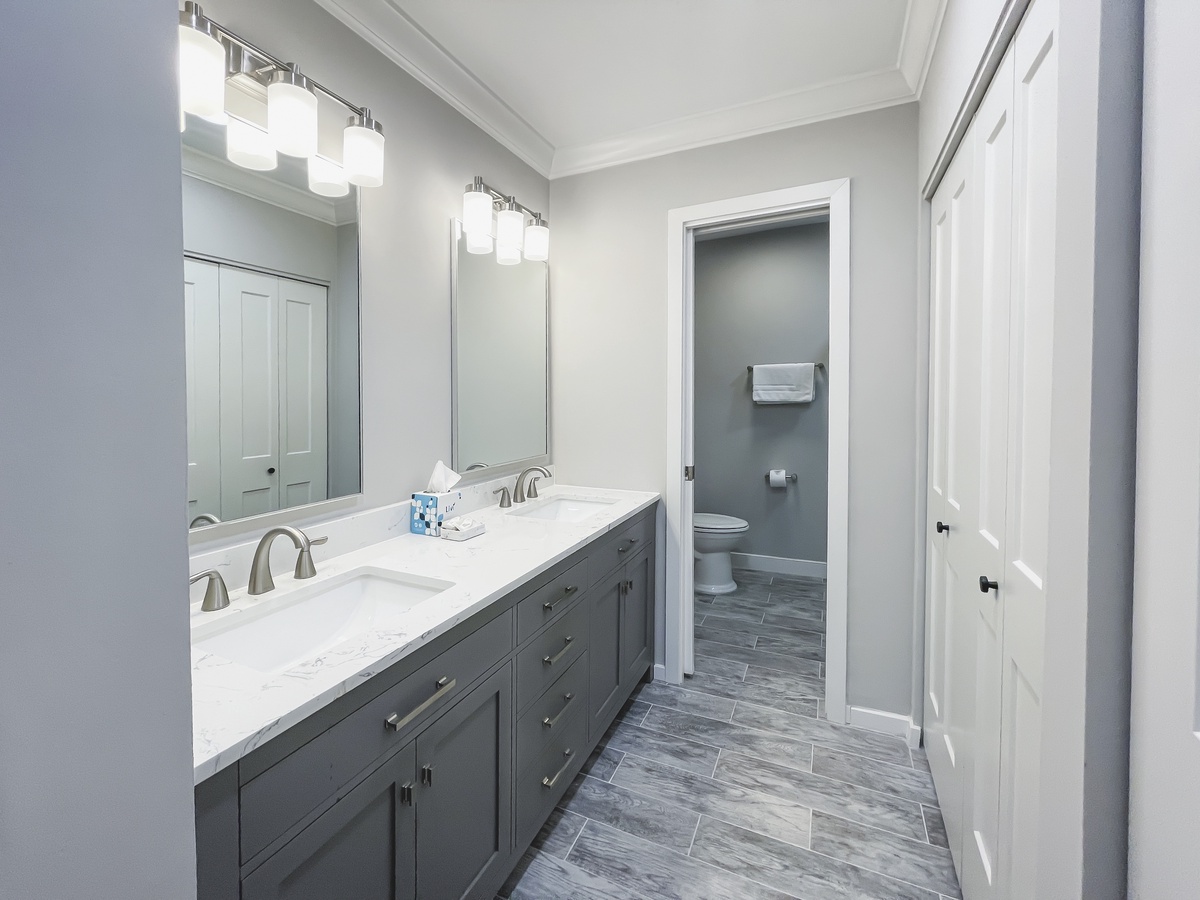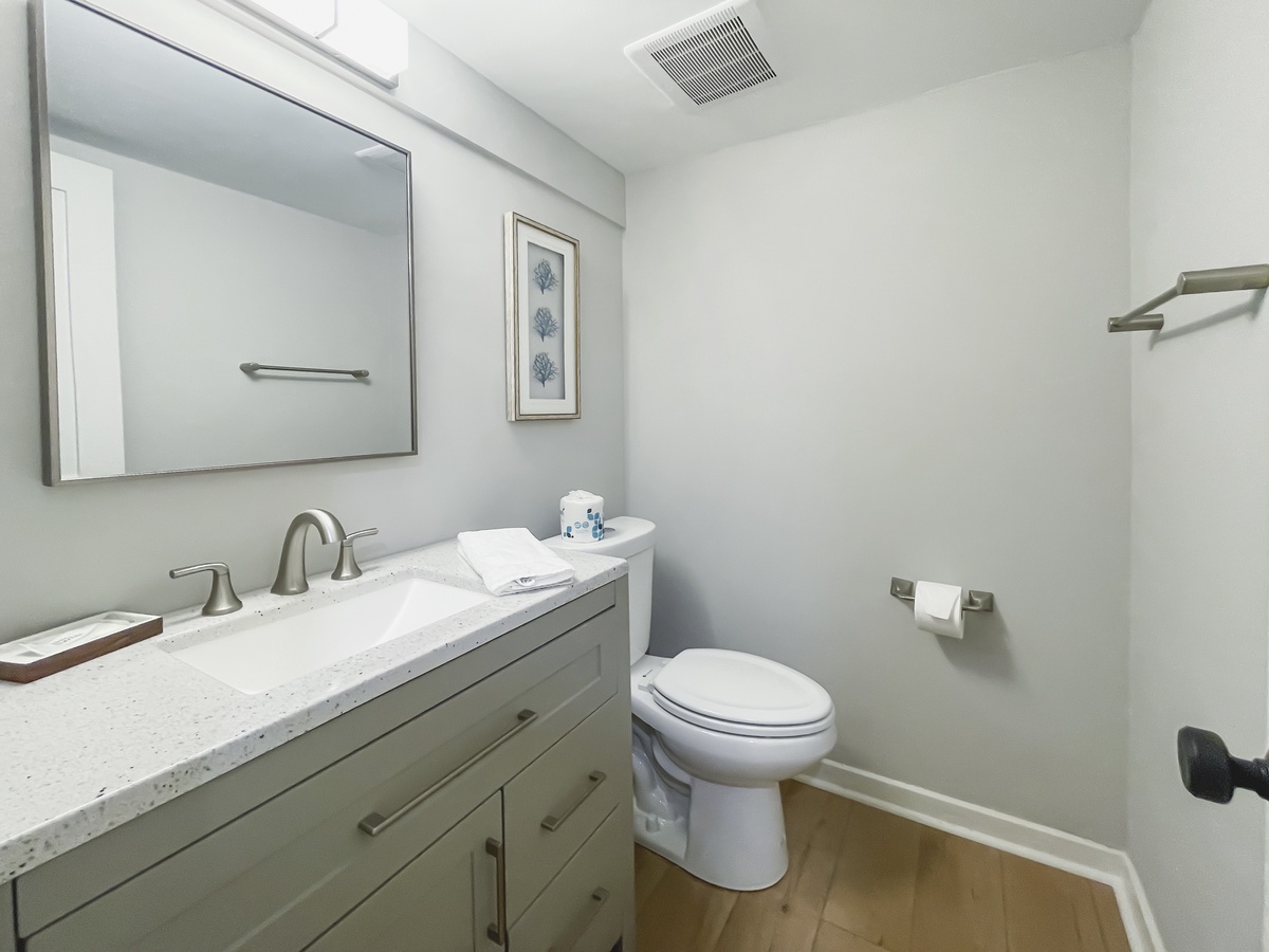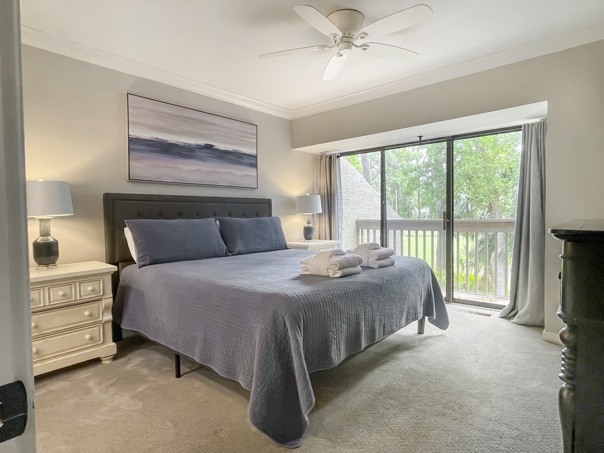Surrounding a wide landing atop a floating staircase the upstairs guest rooms carry this same sense of Lowcountry sophistication and comfort. In one, a pair of double beds enjoy a spacious footprint as well as ceiling fan, flat-screen TV and en suite with tub and shower. The next sees two double beds set before wide windows out toward the golf course, enjoying a space with ceiling fan, flat-screen TV and en suite with shower. Our final guest room serves as the owners’ suite, indulging with every amenity you’d expect from a world-class resort. Unwind on the plush king size bed or throw wide the sliding glass door to enjoy elevated golf course views from your private balcony. Inside, a ceiling fan, flat-screen TV and spa like en suite with walk-in showerhead round out the comforts.