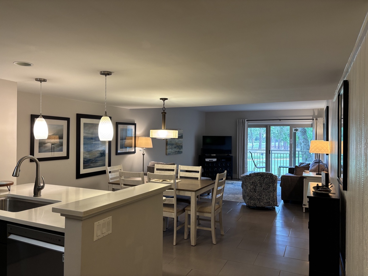 A dining area with seating at either an eye-catching cherry and tile high-top table or at the white stone bar counter shares both the golf course views as well as easy access to the superbly appointed modern kitchen.