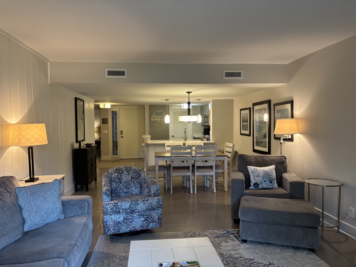 White Coastal-style wood panel walls stretch before you, lining the inviting living area and contrasting nicely with a rich edgecomb gray and subdued blue color scheme. A conversation space carries the color scheme to an elegantly modern exclamation, while sliding glass doors just beyond open to a stunning private balcony view of the 8th green at Atlantic Dunes.
