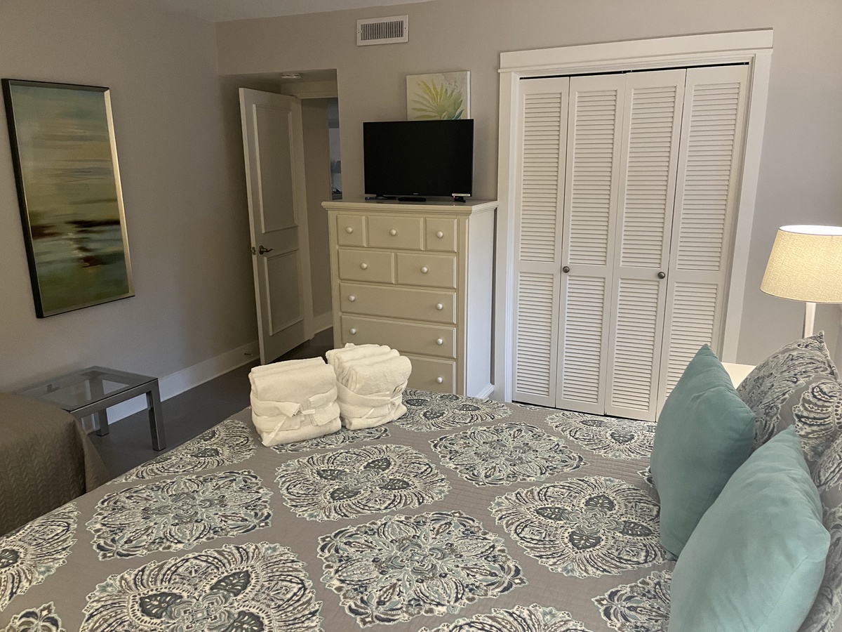 A second bedroom provides ample sleeping arrangements in the form of both a double and twin sized bed, while carrying the same coastal style through plantation shutters and playful mix-and-match linens.