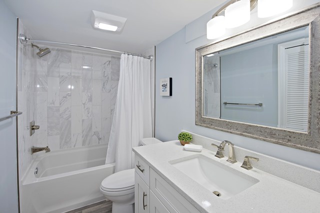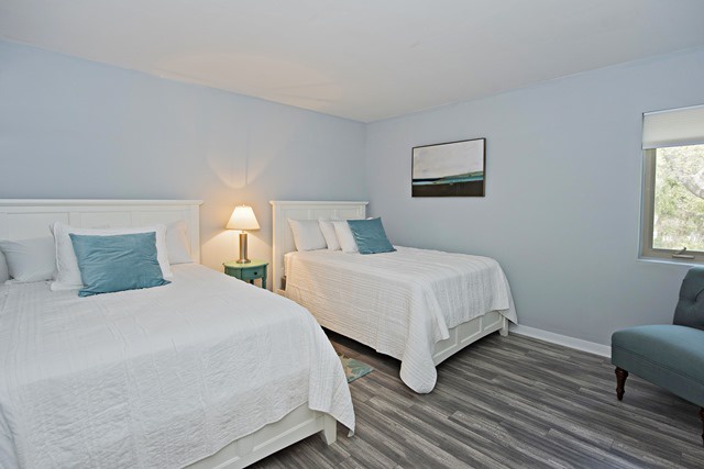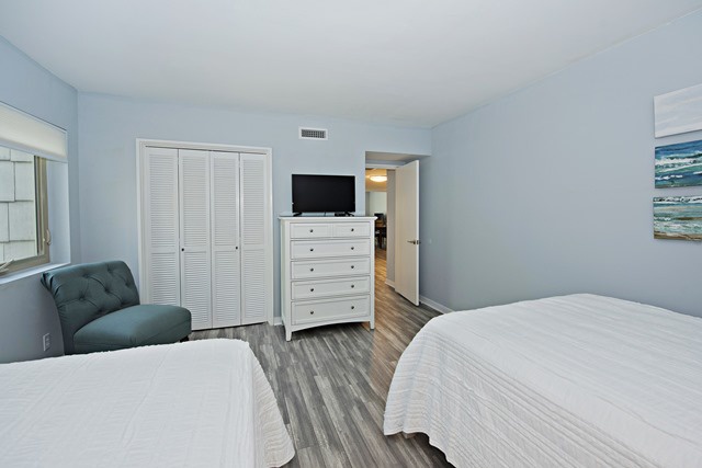The second bedroom includes two double beds, nightstand and a Smart flat screen TV perfect for kids or adults to relax after a long day at the beach. The guest bathroom has modern quartz countertops and tiled tub.