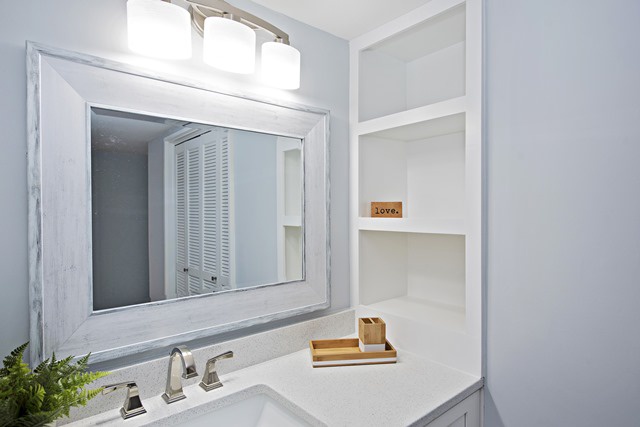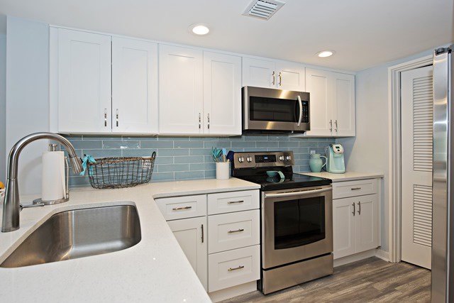 The revised open kitchen floor plan with new shaker style cabinets and quartz countertops provide a clean look and bright beach feel well equipped with all the modern hardware needed to make your vacation a pleasure whether you are cooking or just grabbing a snack.