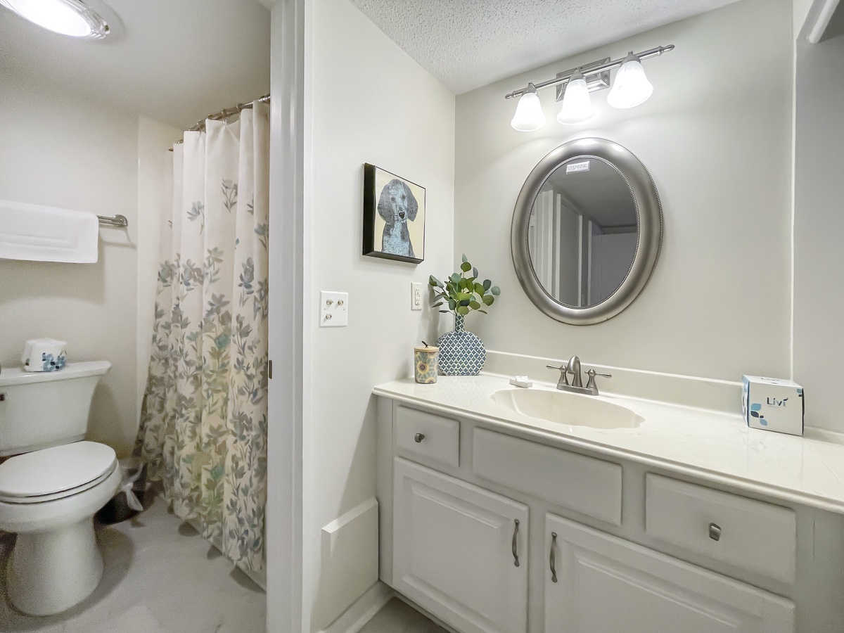 With beach accents, the second bedroom is equally charming with twin beds covered in red and blue, plus there’s a wall mounted flat screen TV and ceiling fan. All in soft blue, the adjacent bath features a tub/shower combination, a solid surface vanity with oil rubbed bronze fixtures.