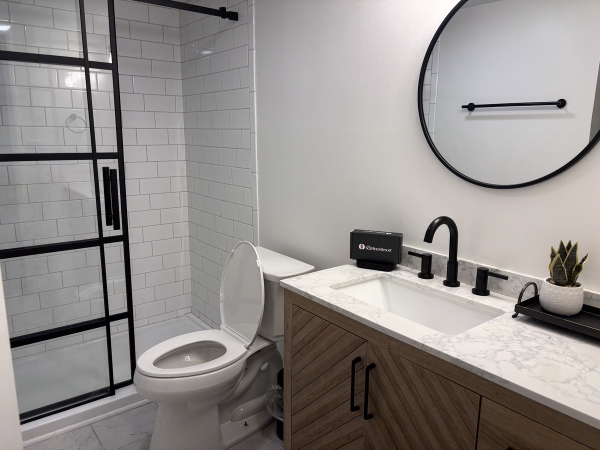 With beach accents, the second bedroom is equally charming with twin beds covered in red and blue, plus there’s a wall mounted flat screen TV and ceiling fan. All in soft blue, the adjacent bath features tile flooring, a quartz vanity with black fixtures and a walk-in shower.