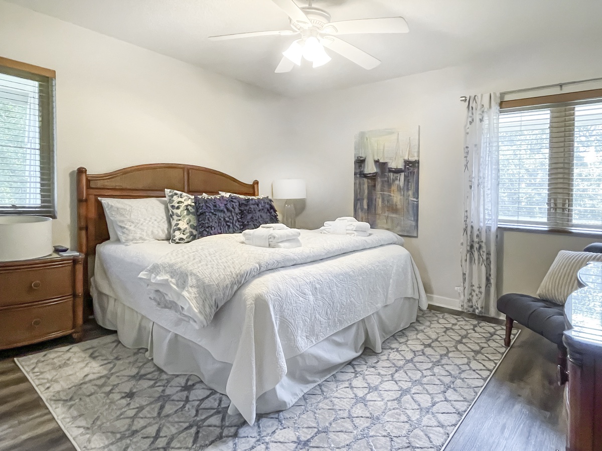 In a quiet blue, the master features a king sized bed, a wall mounted flat screen TV, ceiling fan and view of the links below. The master bath features tile flooring, a cultured marble vanity with brushed nickel fixtures and a tub/shower combination.