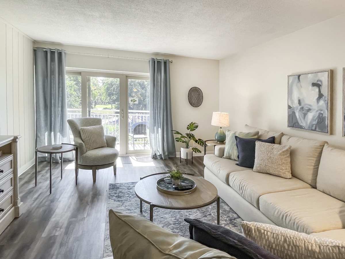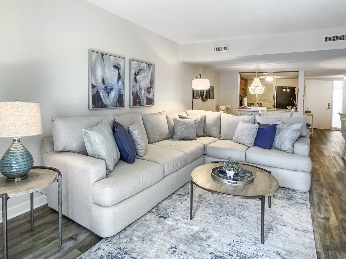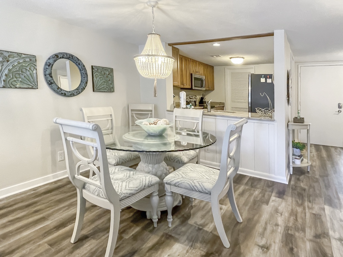 In its combined living room and dining room space, furnishings are light and airy, featuring a relaxed, beachy motif. The living area showcases a wall-mounted flat screen TV, surrounded by appointments in Coastal tones of sand and sea. Sliding glass doors open to a private patio with seating for two overlooking the moss-draped oaks and the fairway. A scalloped edged glass topped dining room table seats five comfortably.