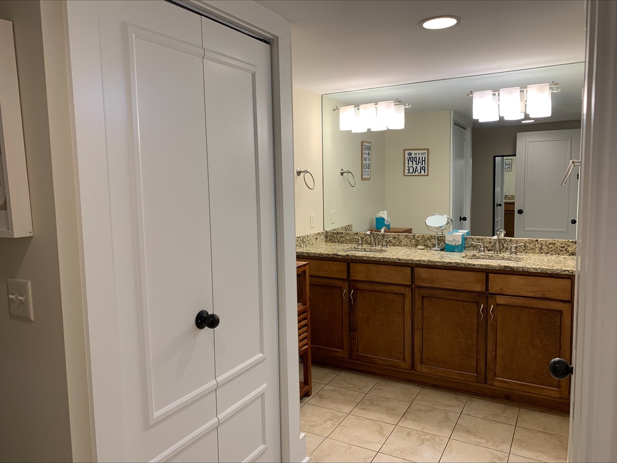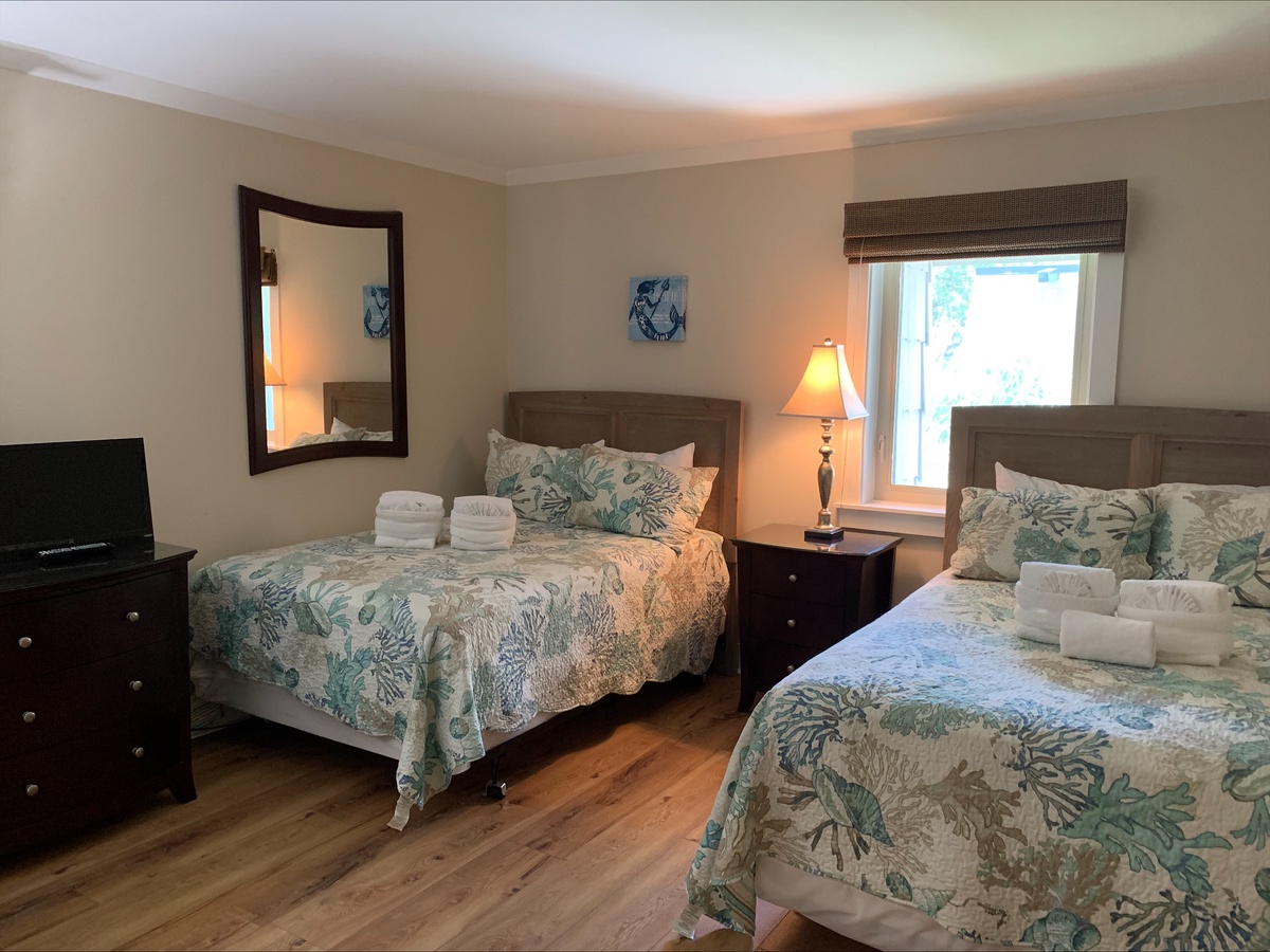Two bedrooms offer the utmost in comfort, starting with a guest room marked by two double beds, flat-screen TV and windows on two walls for lush natural light. This room enjoys access to a private bath with wide granite counters on a single-basin vanity as well as tub and shower. The master suite indulges with a plush king-size bed set among windows on two walls, flat-screen TV and private en suite with dual-basin vanity, tub and shower with dual showerheads.