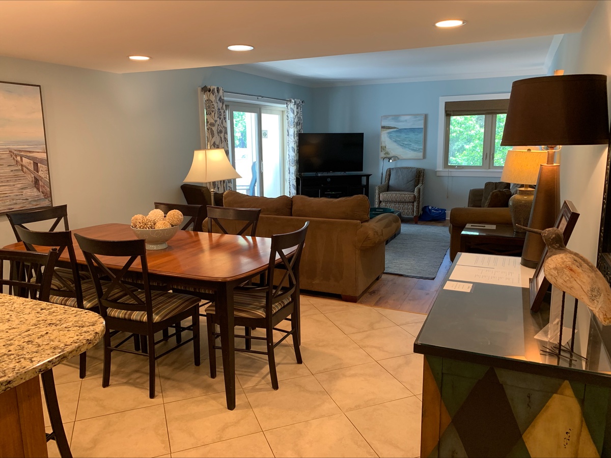 The open living space stretches from the chef’s kitchen out to a living room space, marked by sleeper sofa and loveseat in comfortable microsuede. The front a flat-screen TV as well as sliders that give way to a cozy patio enjoying lofty views of Atlantic Dunes’ 9th hole.