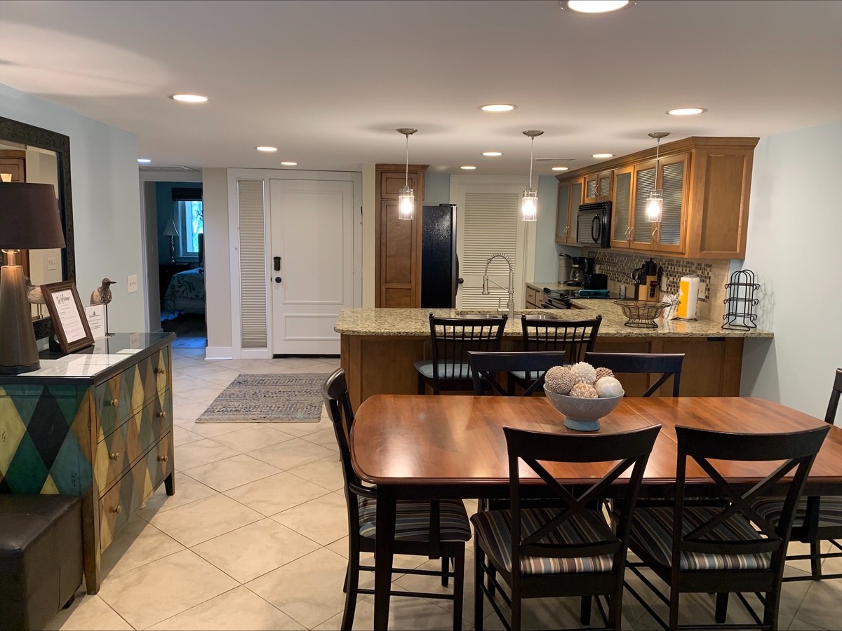 The dining space offers seating for six, with additional bar seating for two at the wide granite countertop that encircles the kitchen. Here, among updated countertops and appliances you’ll enjoy plenty of space for cooking and entertaining.