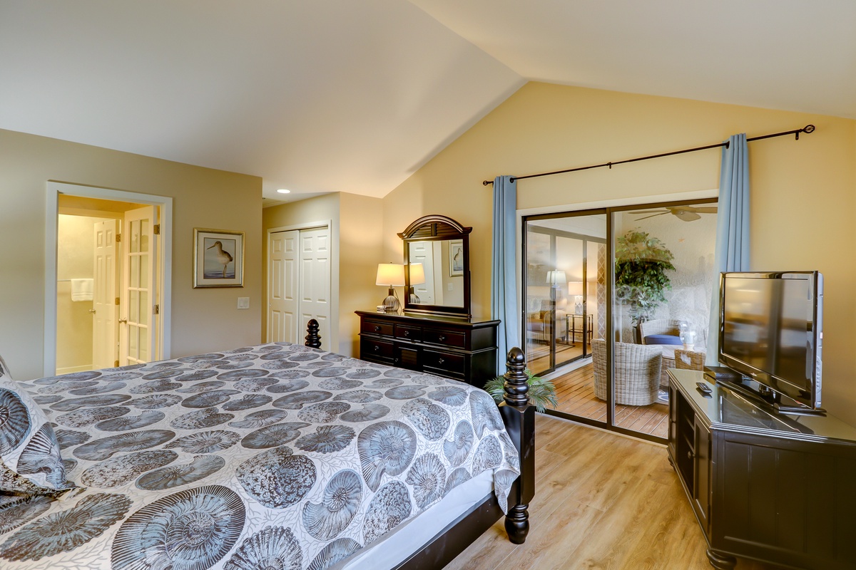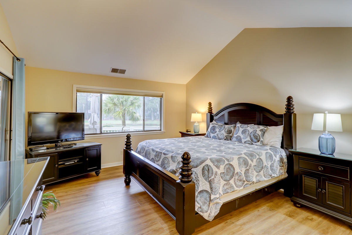 The master suite exults in sunshine, with sliding glass doors out to the Carolina room and wide windows basking in the view of the 10th fairway. Tall vaulted ceilings create a sense of space above a wide king bed wrapped in linens festooned with colorful shell patterns contrasted against rich dark furnishings. Through a door inlaid with beveled glass you’ll find the spacious en suite with wide counters on a single basin vanity, roomy tub and shower.