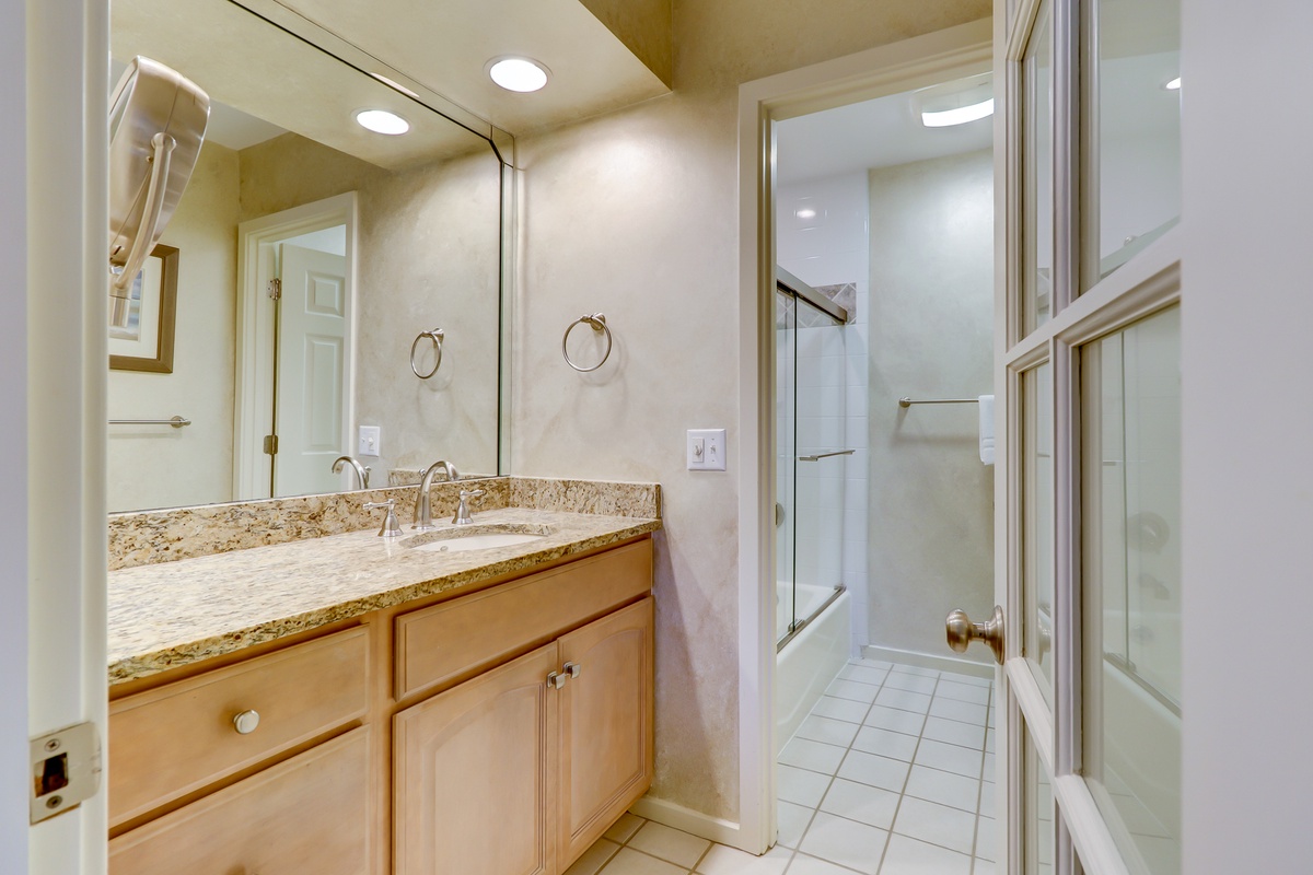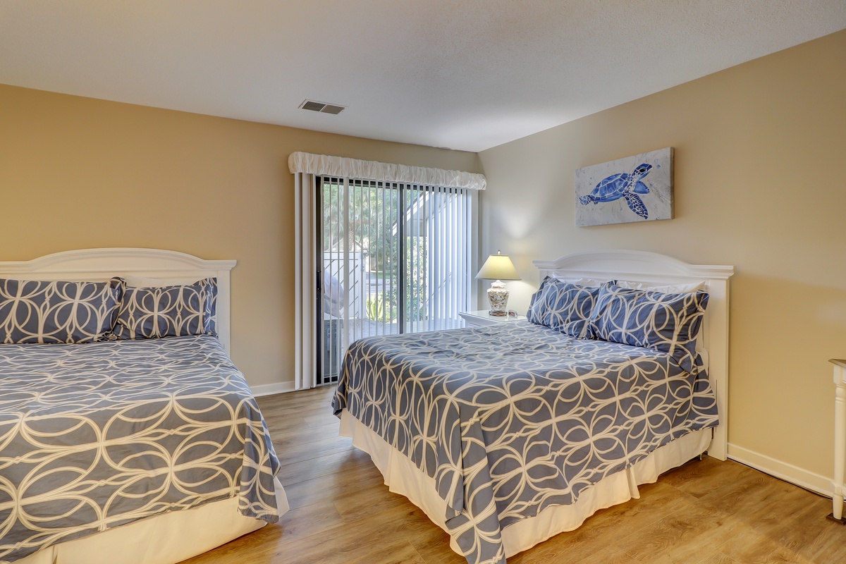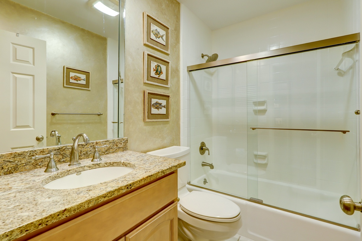 Two bedrooms provide ample comfort and respite. The first pairs two double size beds in linens of blue and white among tall windows and a set of sliding glass doors that lead out to the front patio. This tranquil oasis enjoys access to a private bath with speckled granite counters on a single basin vanity and lovely textured walls leading to a tub and shower combo.