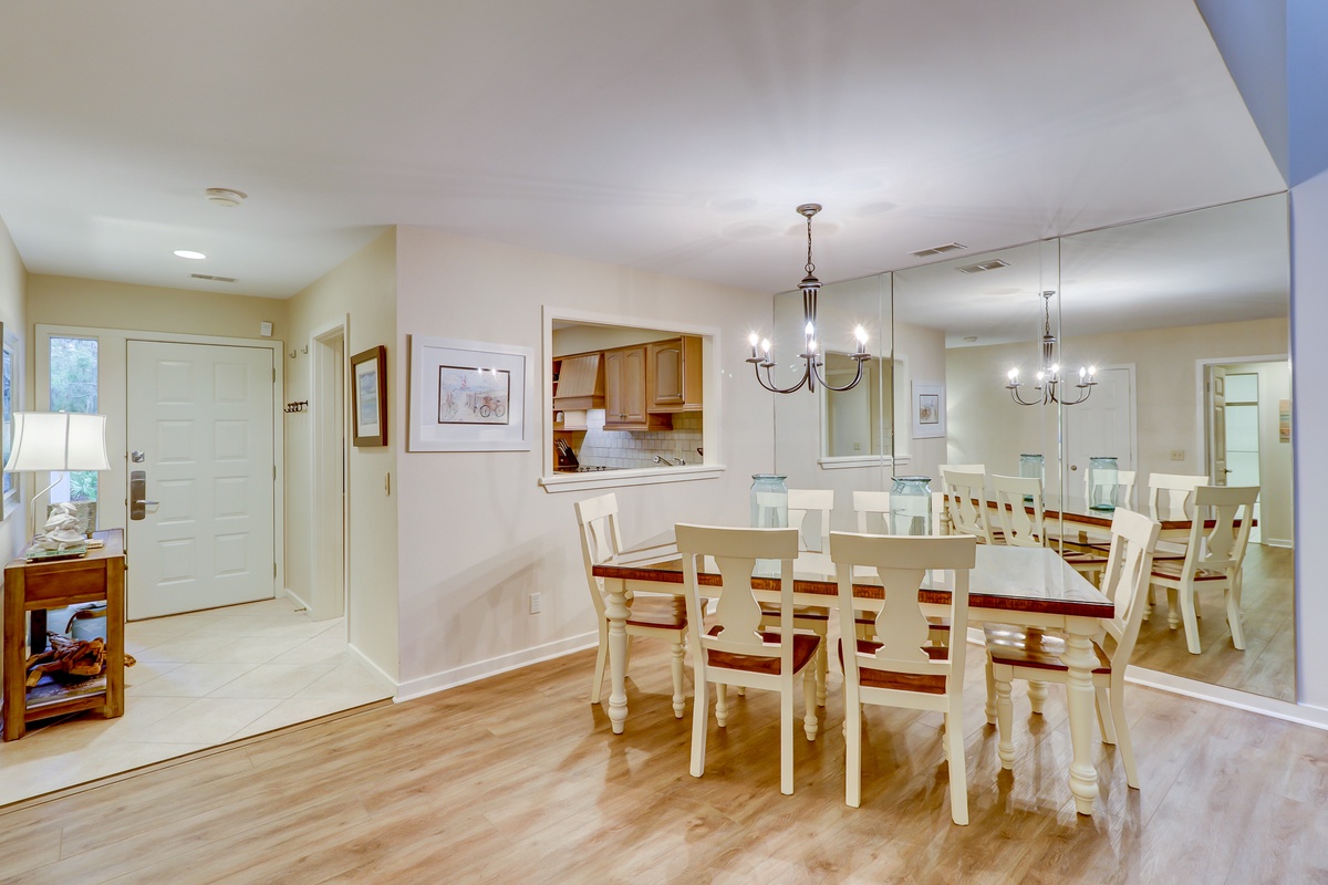 Those meals can be taken at the dine-in breakfast nook in the glow of tall windows, or just beyond the kitchen’s wide pass-through window in the spacious dining room, open to the main living space. A mirrored accent wall creates a sense of space, as does the roomy dining table with seating for six below a beautiful wrought-iron chandelier.