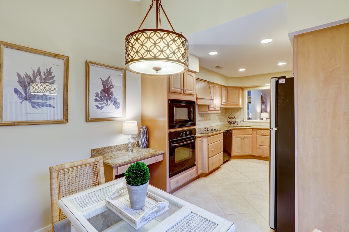 Inside, you’ll find attractive upgrades in the kitchen, including wraparound speckled granite counters set against tiled backsplash and maple cabinets with brushed steel hardware. A stainless steel refrigerator, flat cooktop stove and spacious GE oven round out the gourmet amenities that let you prepare amazing meals.