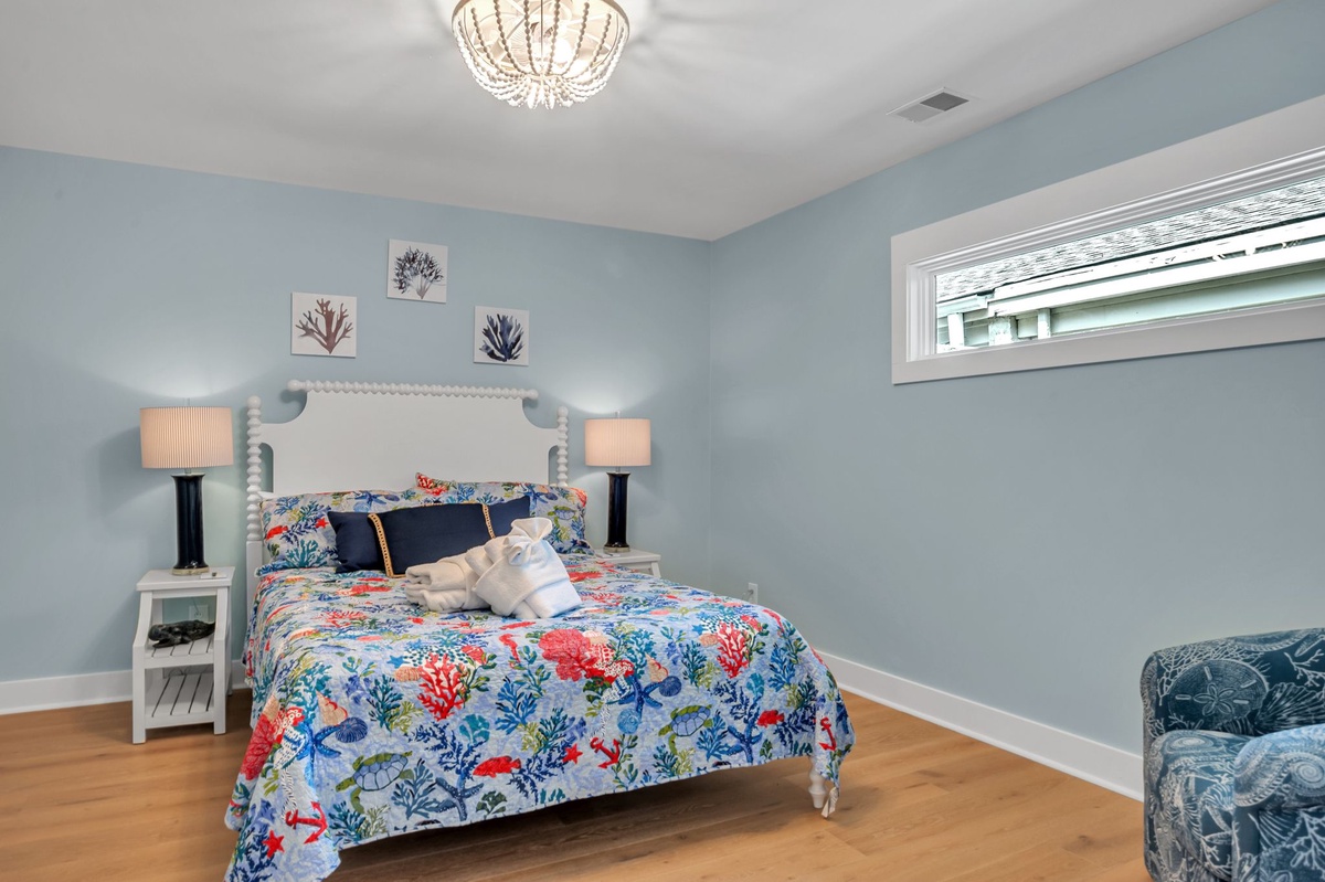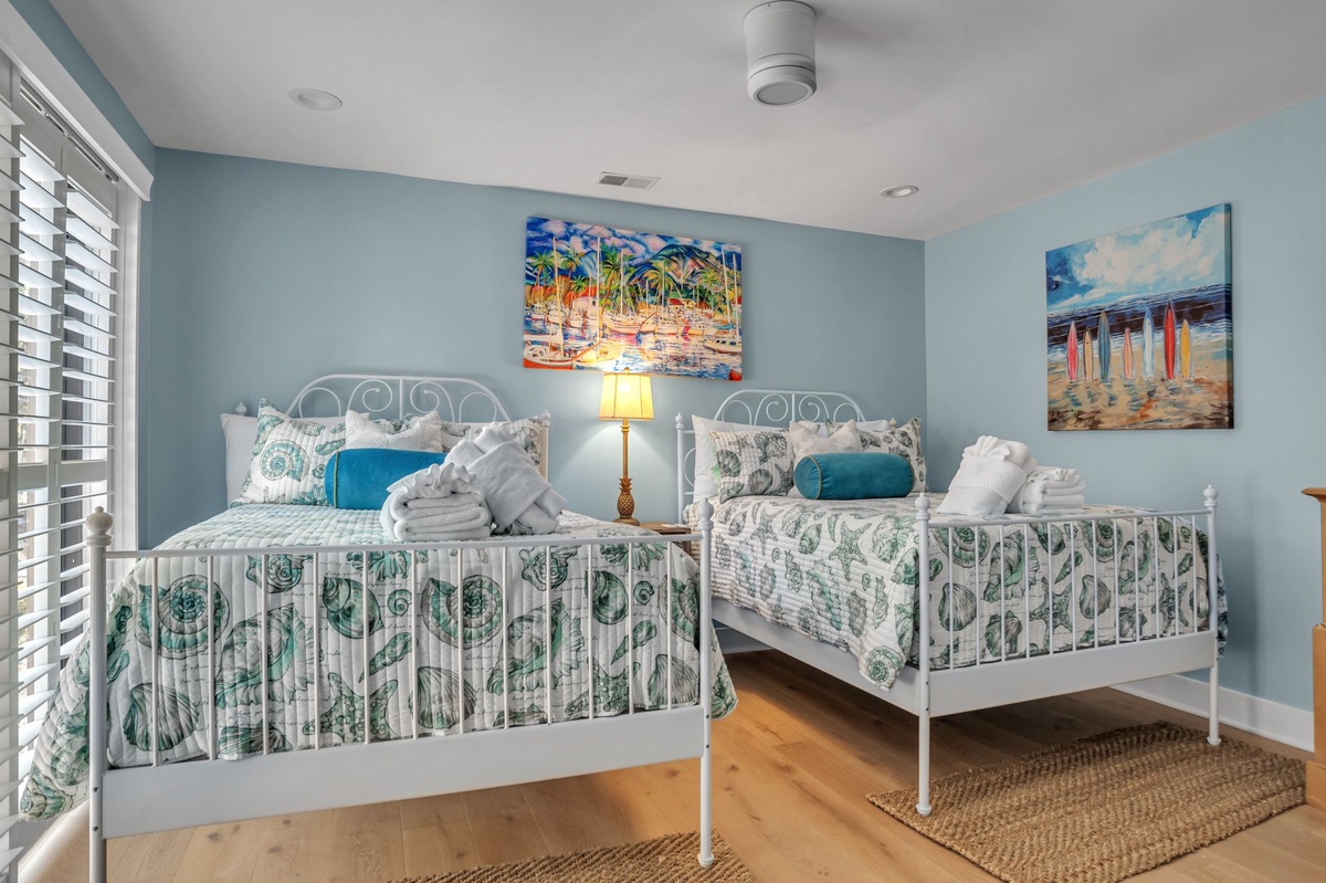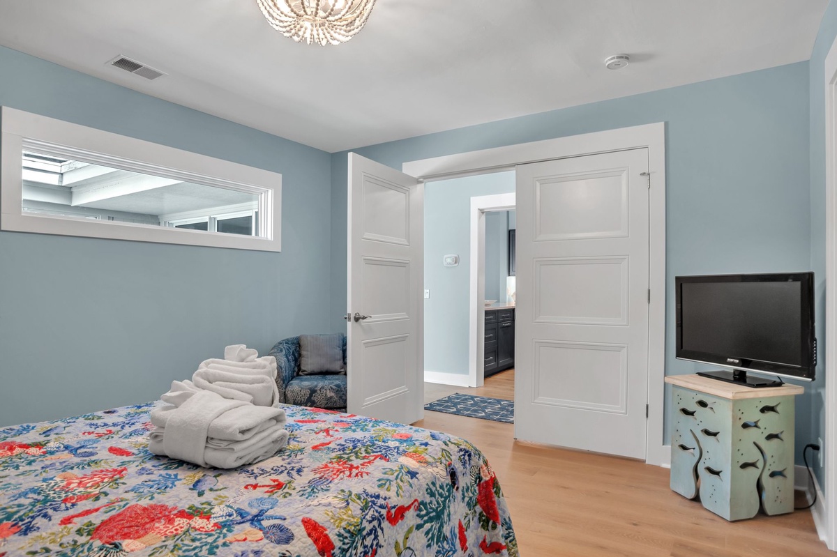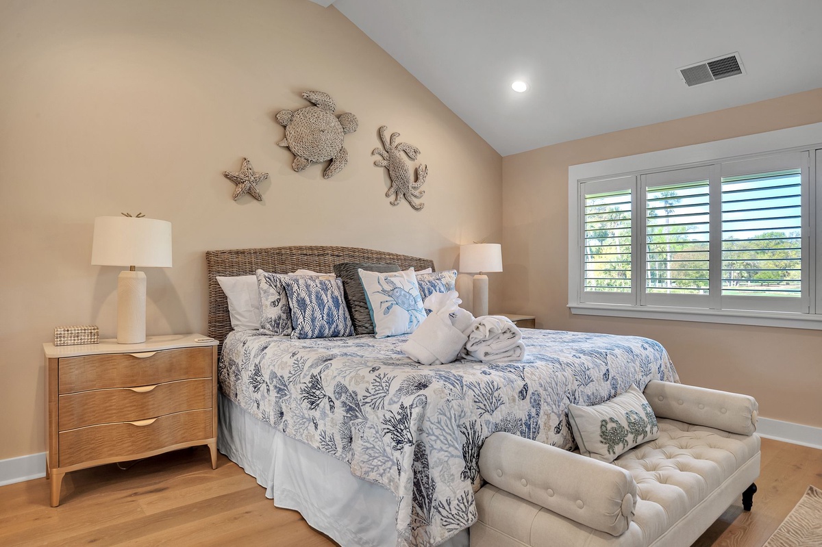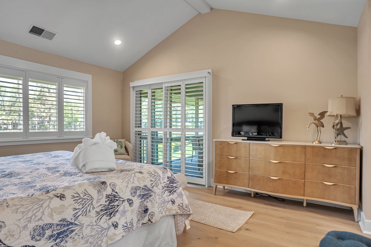 A pair of elegantly appointed bedrooms, one with a queen bed and one with dual double beds and both with personal flat-screen TVS, enjoy access to a private bath with walk-in shower set in beautifully updated tiles. The expansive primary suite offers a king-size bed beneath a cathedral ceiling with private access to the screened porch, and an ensuite bath boasting walk-in shower.