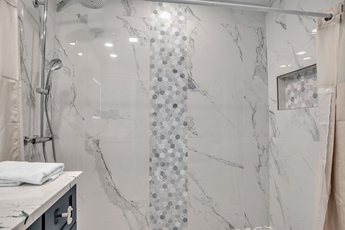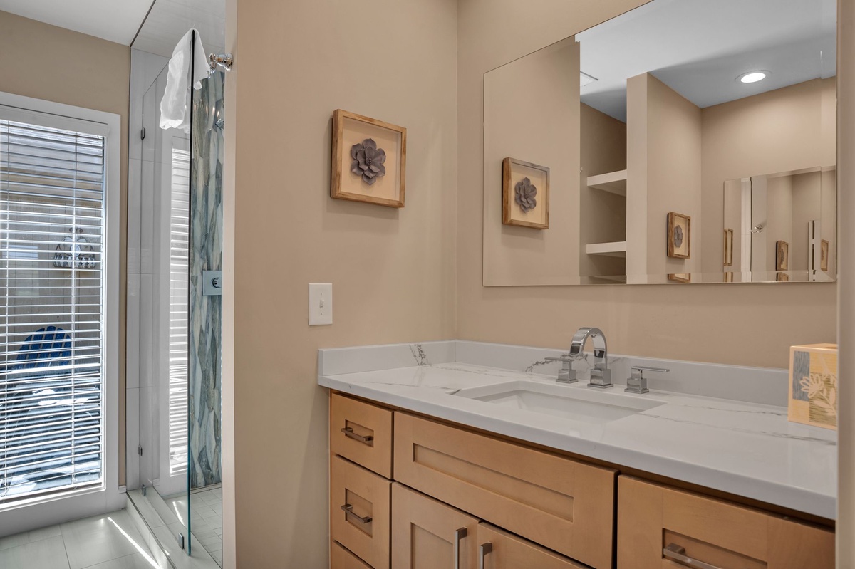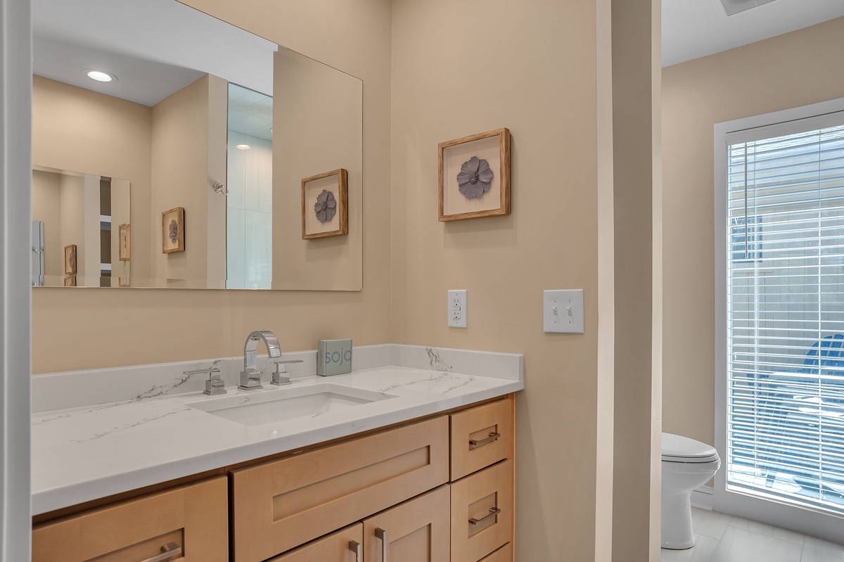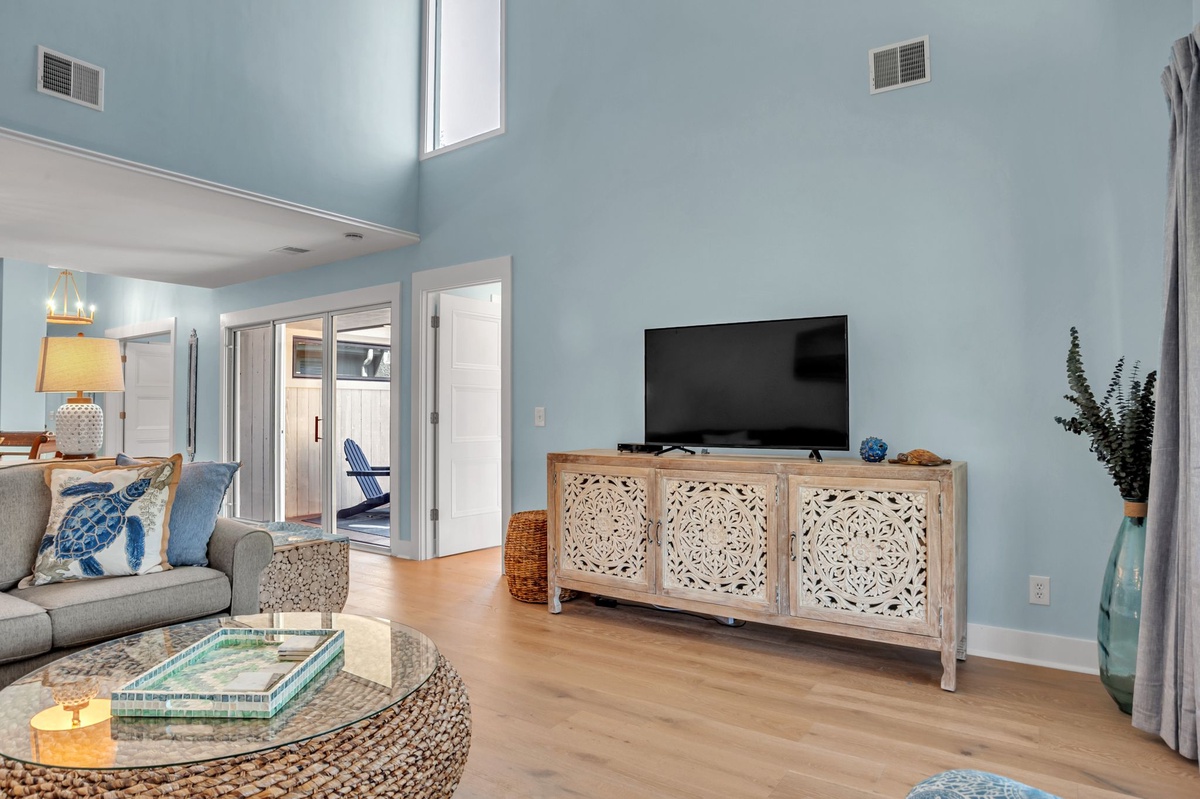 A pair of elegantly appointed bedrooms, one with a queen bed and one with dual double beds and both with personal flat-screen TVS, enjoy access to a private bath with walk-in shower set in beautifully updated tiles. The expansive primary suite offers a king-size bed beneath a cathedral ceiling with private access to the screened porch, and an ensuite bath boasting walk-in shower.