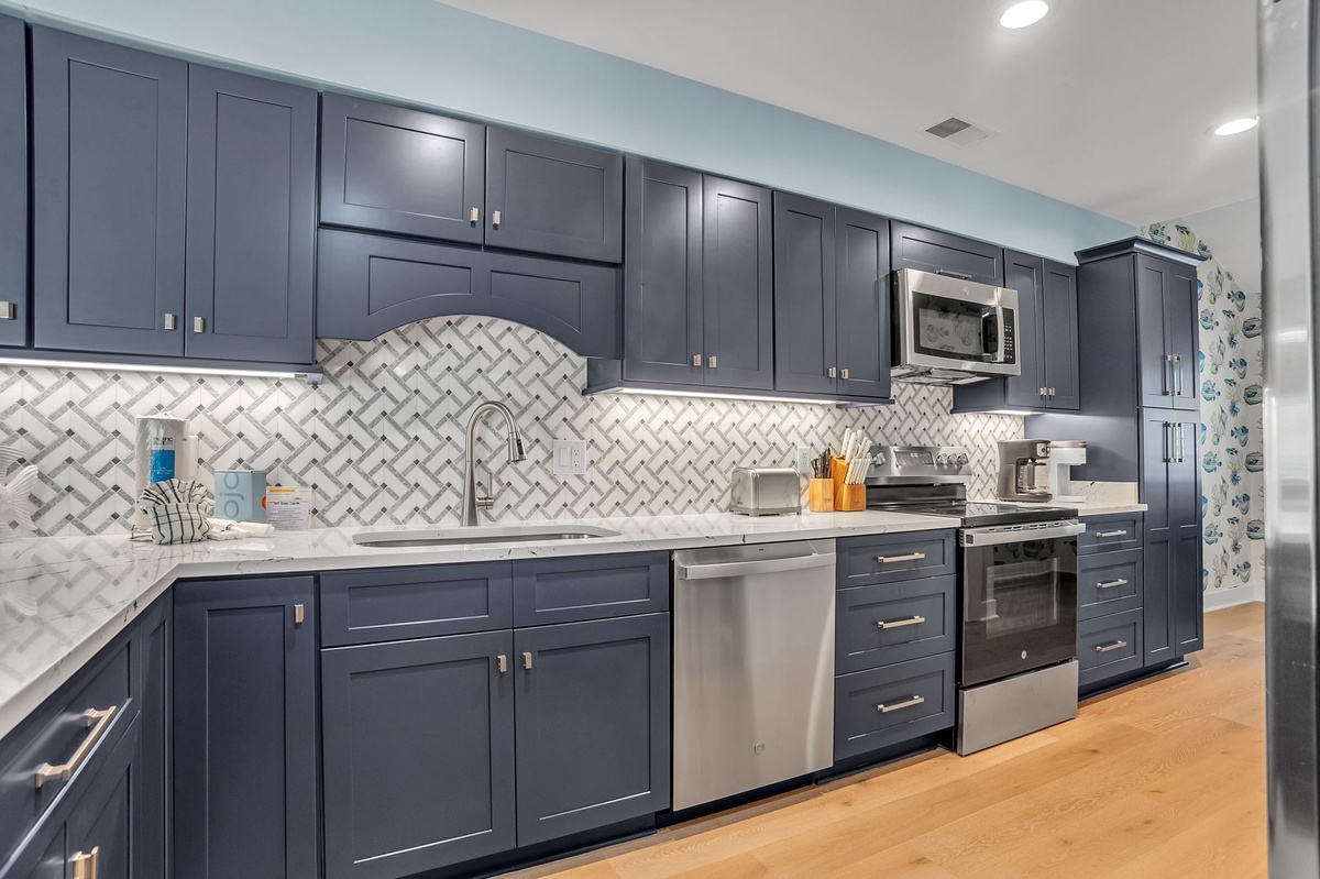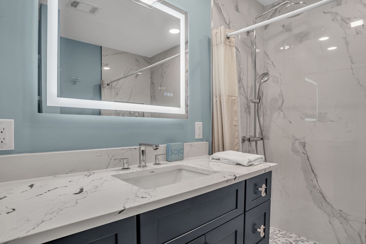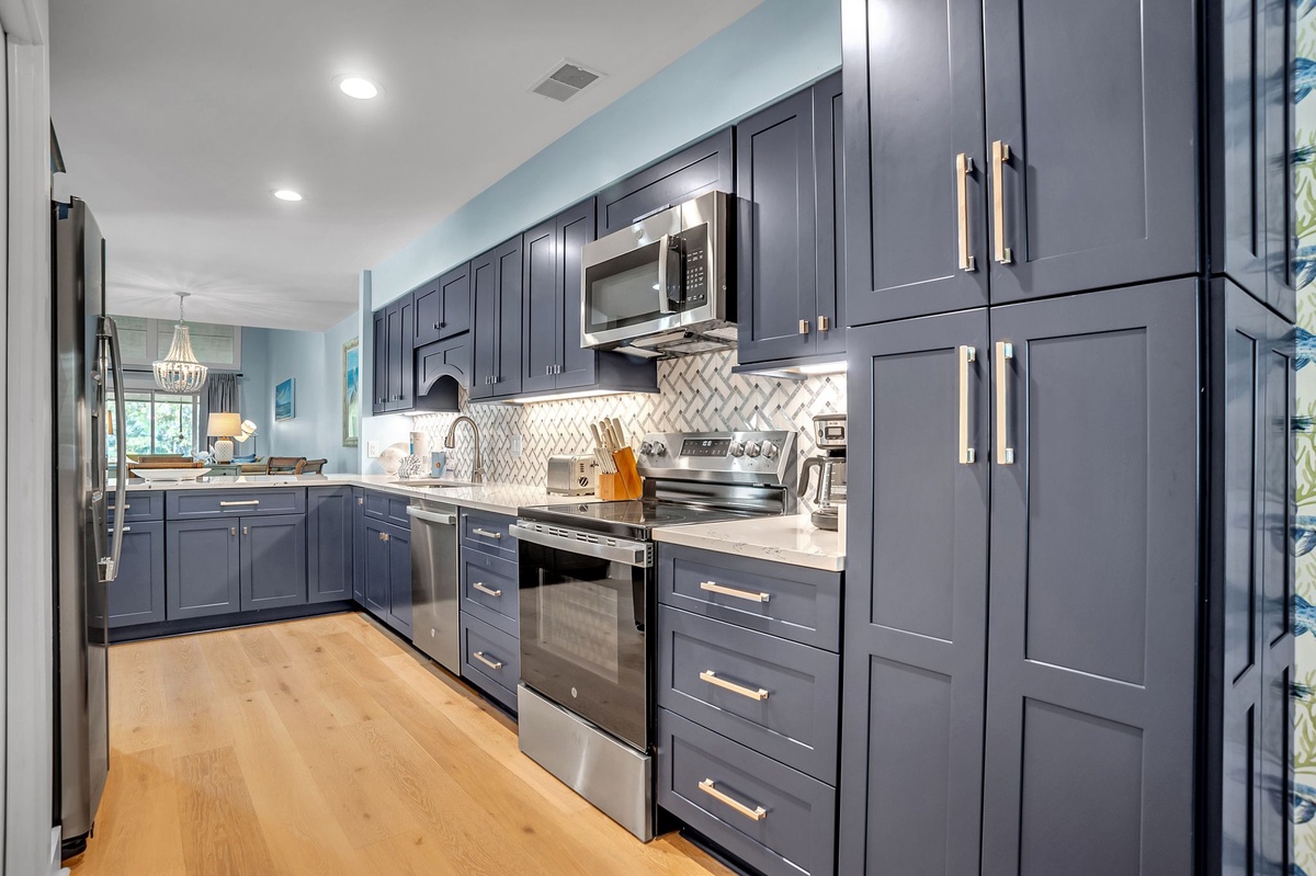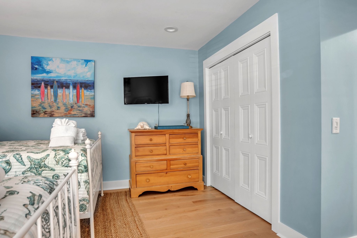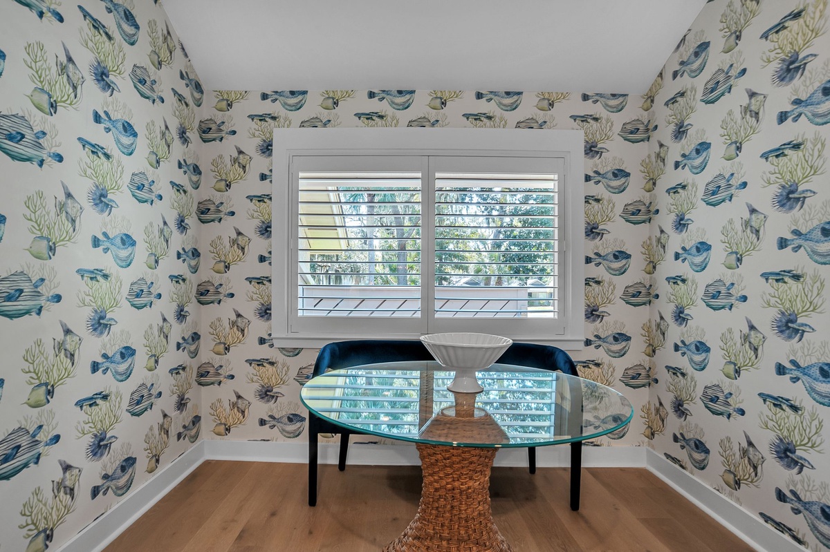 A pair of elegantly appointed bedrooms, one with a queen bed and one with dual double beds and both with personal flat-screen TVS, enjoy access to a private bath with walk-in shower set in beautifully updated tiles. The expansive primary suite offers a king-size bed beneath a cathedral ceiling with private access to the screened porch, and an ensuite bath boasting walk-in shower.