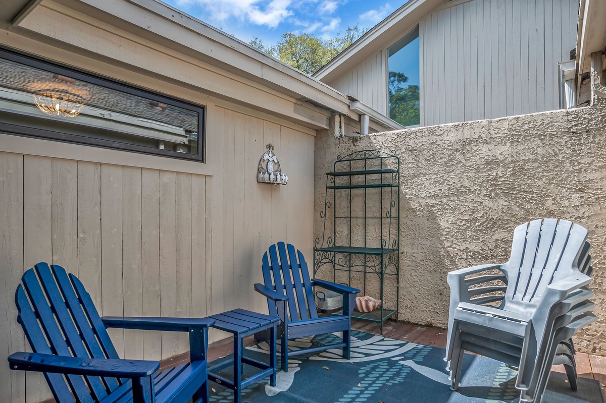 Open to this space, the formal dining area seats six with nearby bar seating for an additional three at a pass-through to the wonderfully updated kitchen. With tan granite counters encircling new stainless-steel appliances and craftsman cabinets, this space transitions to a cozy breakfast nook and convenient washer and dryer. Off to one side, of the main hall, sliding doors open to a serenely private inner courtyard bathed in sunlight.