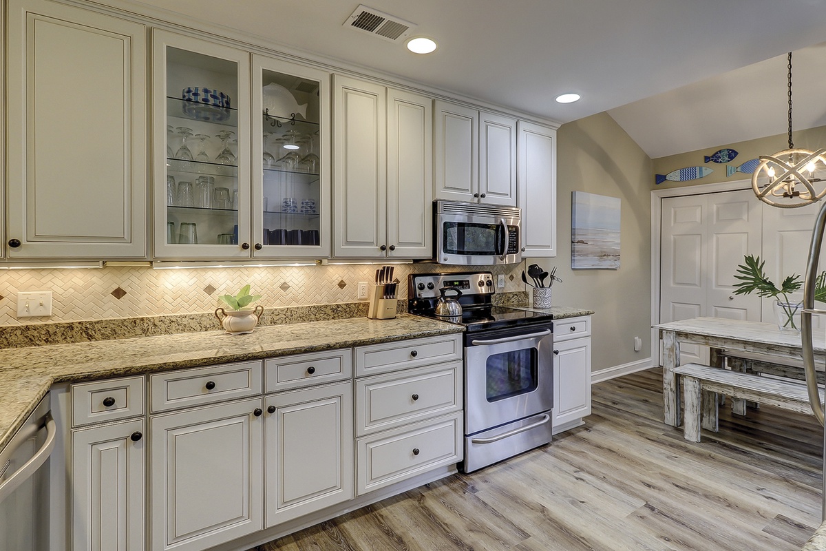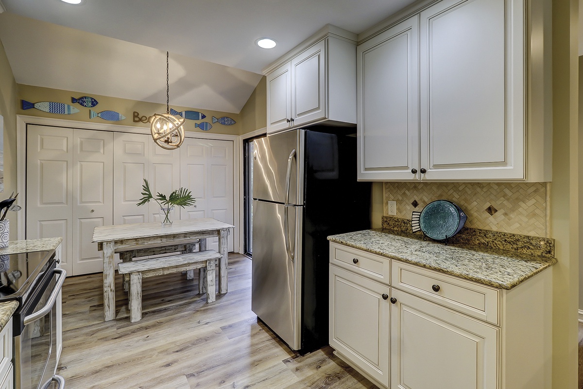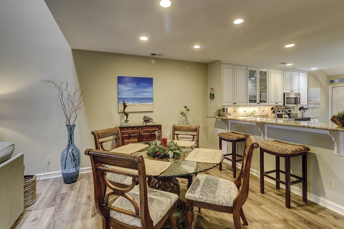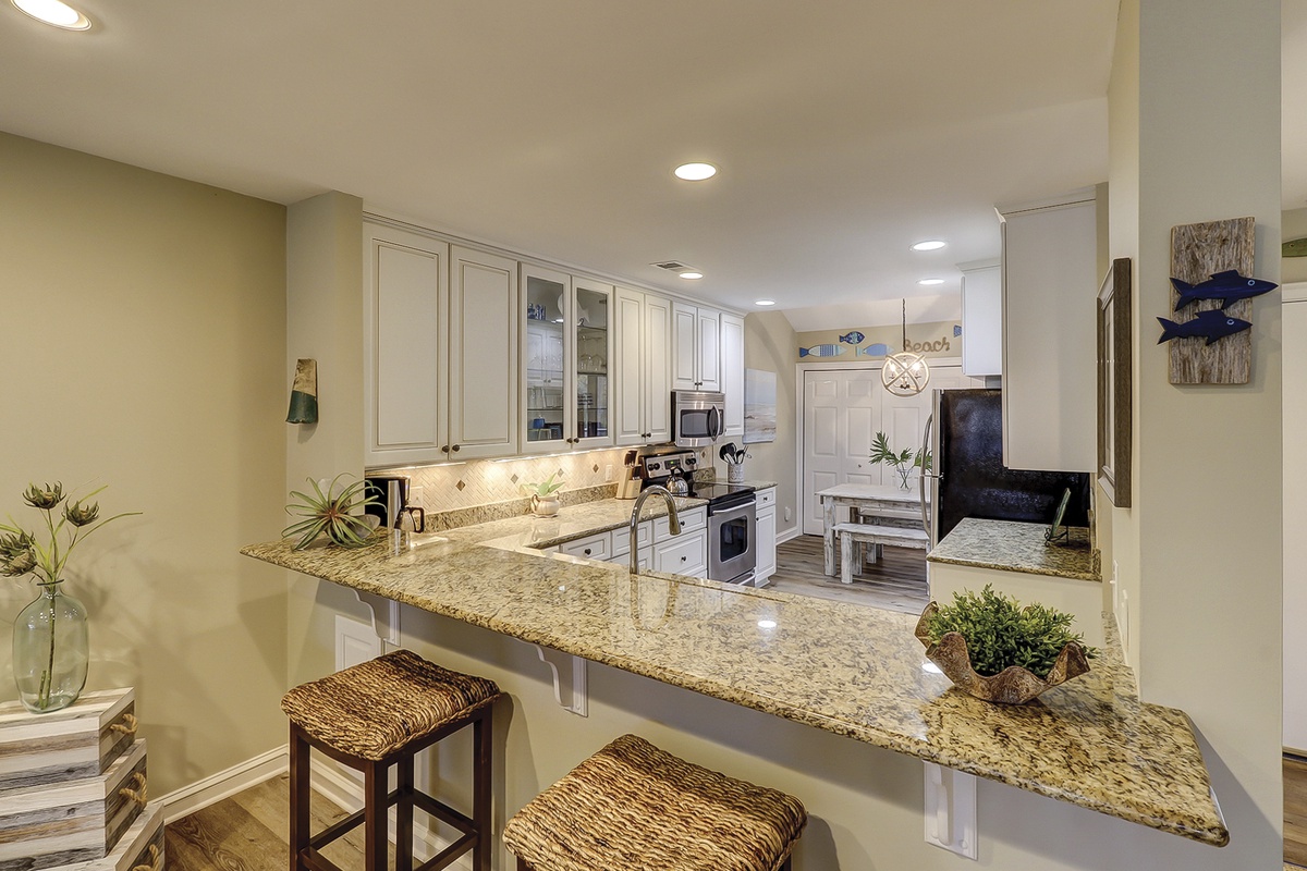 Open from the living room; the dining area seats up to six stylishly at its round glass table. Spacious, fresh, and light, the renovated kitchen showcases warm granite countertops, stainless steel appliances, and counter seating for two. The kitchen also offers a rustic beach inspired breakfast table for four and a convenient laundry closet.