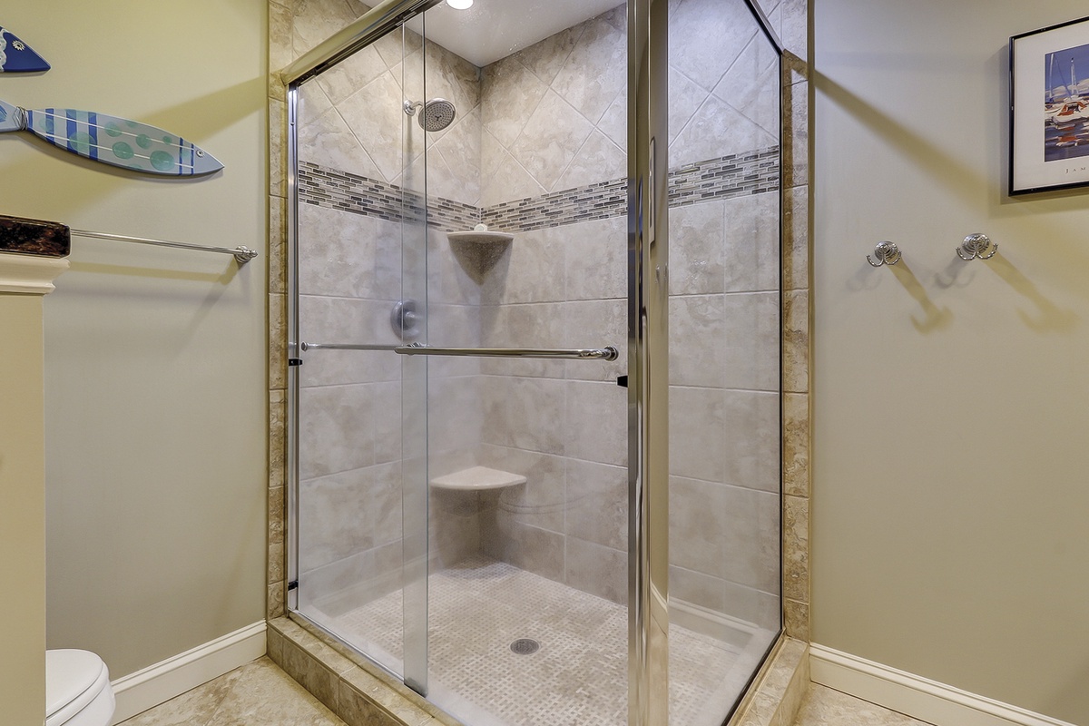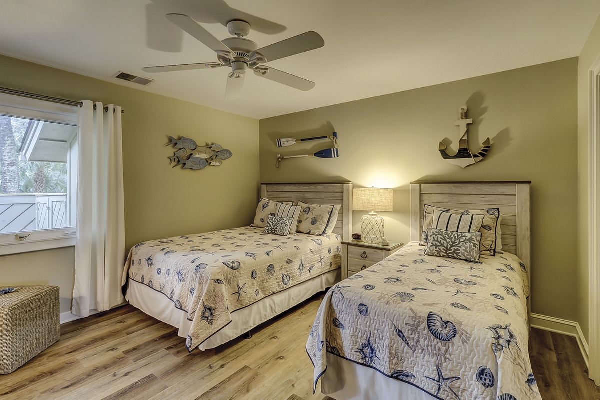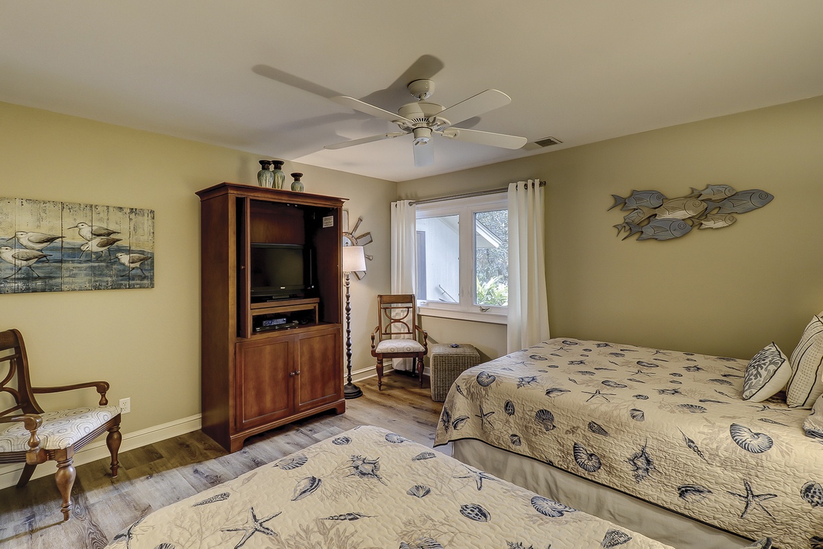 The second bedroom offers a queen-sized bed and one twin bed, a stately armoire with a flat-screen TV, a ceiling fan, and ample closet space. The updated guest bathroom features a tan granite vanity and glass door stone-surround tub/shower combination.