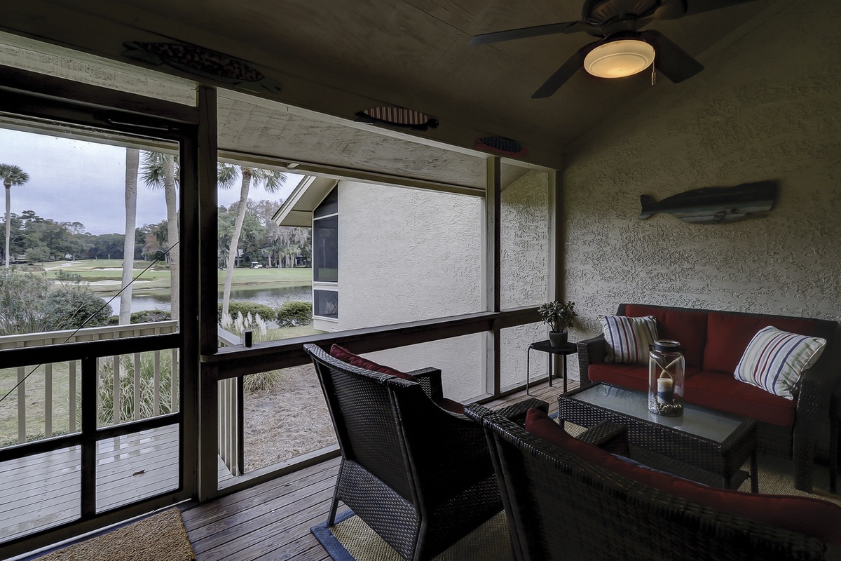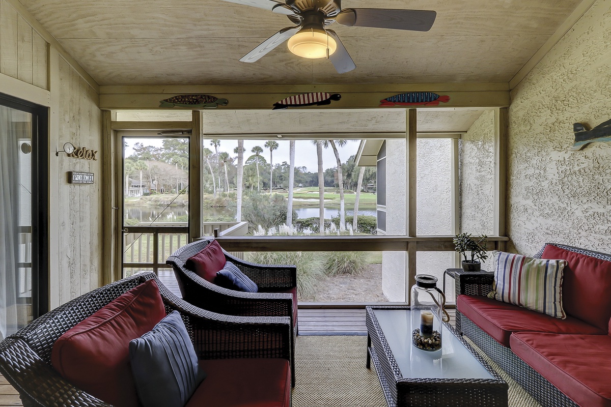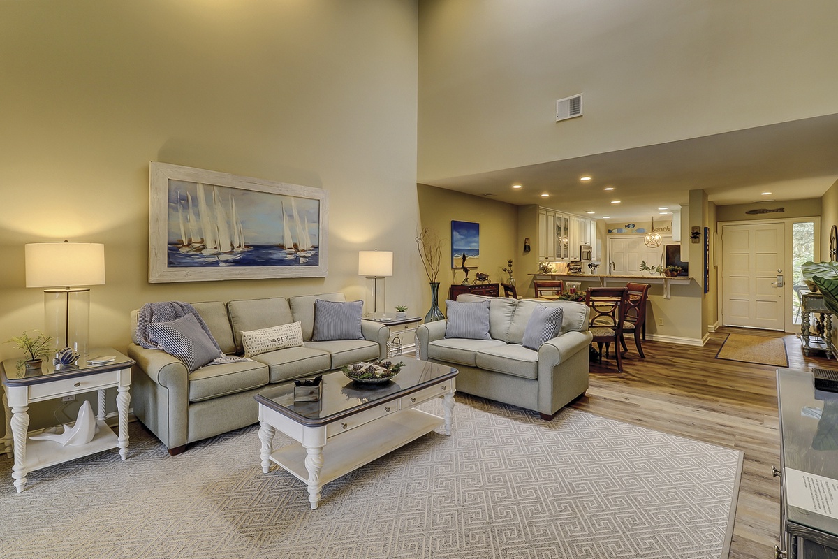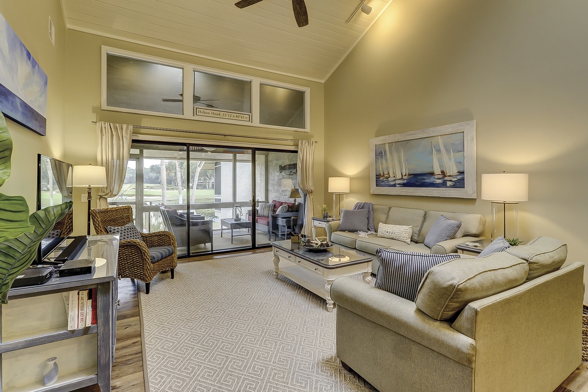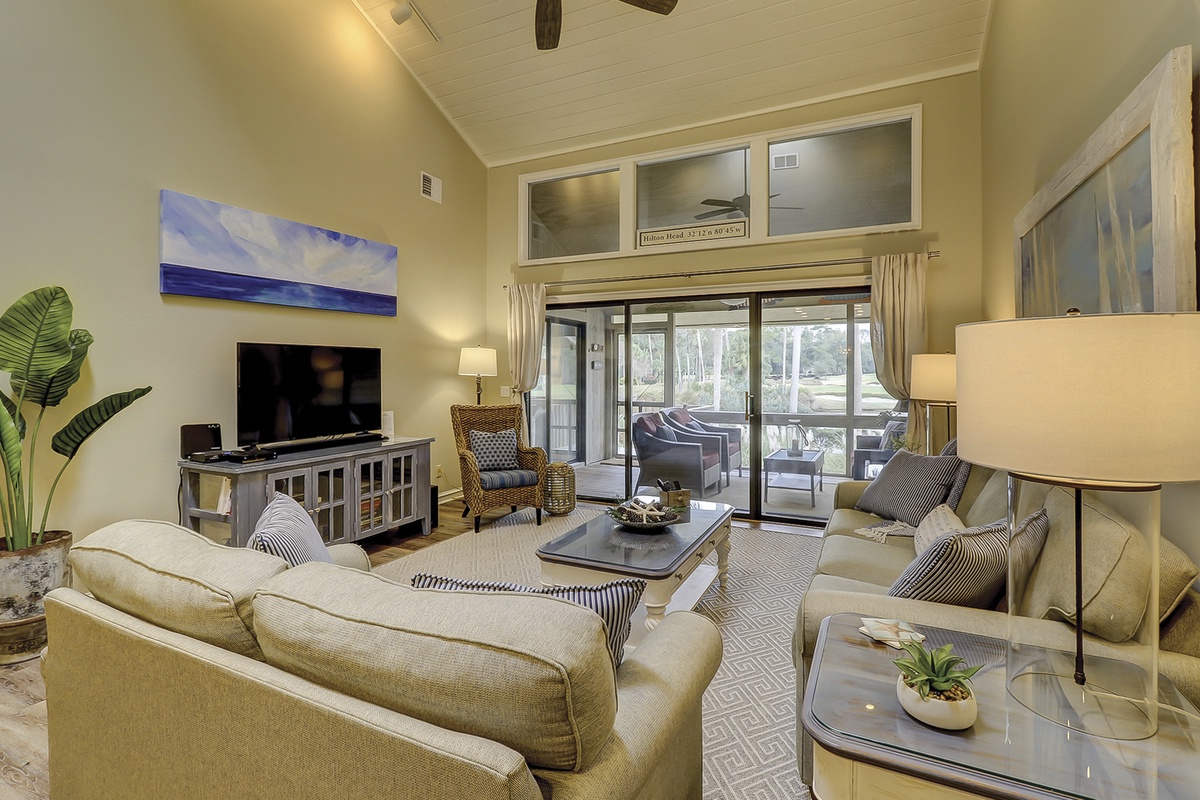 In warm hues of coastal sage, the attractively furnished living room offers an inviting sitting area with a large 42" flat-screen TV, soundbar, sofa, love seat, high ceilings, and skylights. Sliding glass doors reveal a heavenly screened porch, overlooking a scenic vista of the lagoon and fairway.
