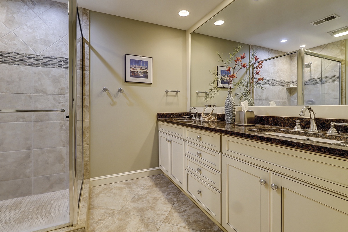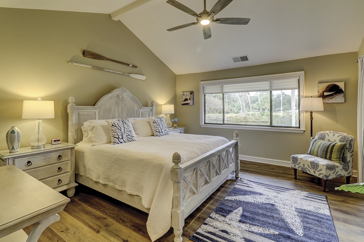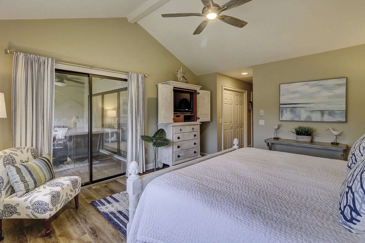 The master bedroom features a king-sized bed, flat-screen TV, vaulted ceiling with fan, and access to the screened porch. The chic master bath includes a coppery-brown granite double vanity and a stone-surround glass door shower with accent tile.