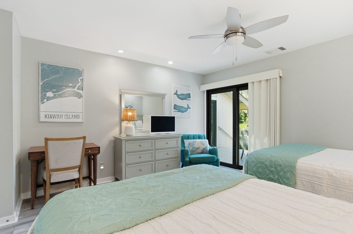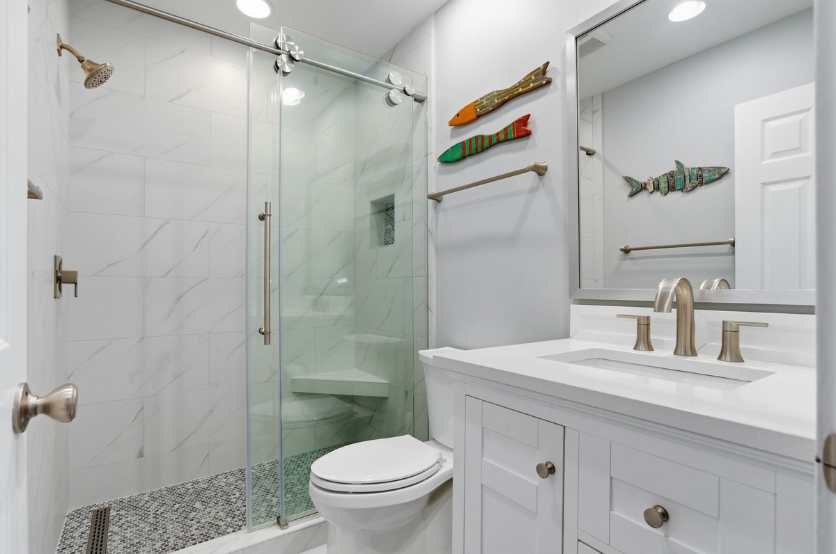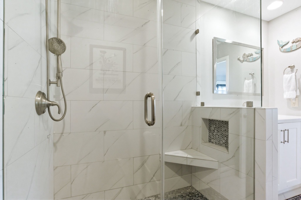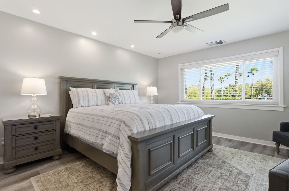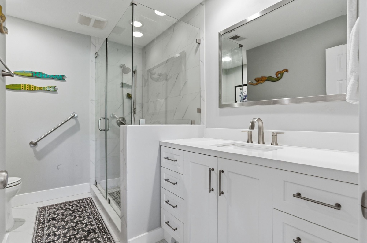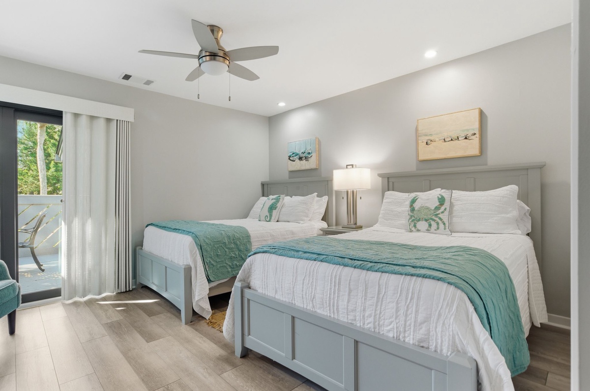 Both bedrooms indulge with comfort and style. The first sees two double beds set before sliders that guide you out to the front porch, and enjoys access to a full bath with tub and shower. The master suite ups the ante with resort-style comforts including a king-size bed, private sliders out to the screened-in porch and spa-like en suite boasting a spacious walk-in shower.