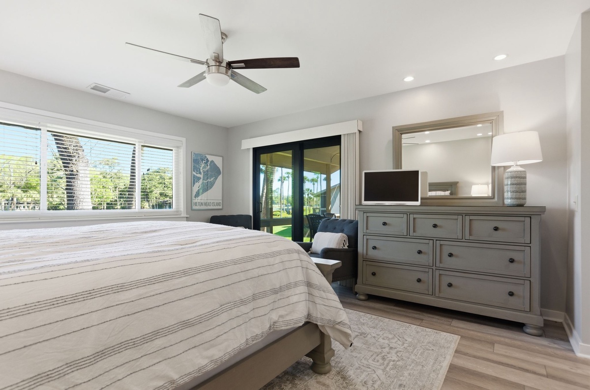 Here, wide-plank flooring guides your eye down to a blissful open living space with spacious loveseat and sofa in steel gray against walls of robin’s egg blue, with a wide flat-screen TV perfect for entertaining. Step through and you are unwinding on a serene screened-in porch overlooking tranquil lagoons and the 10th hole at Atlantic Dunes by Davis Love III.