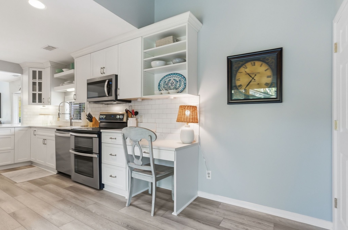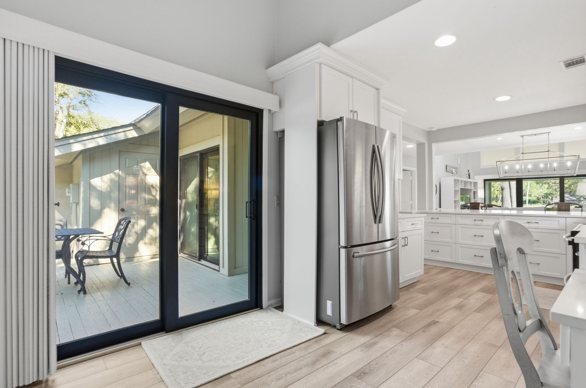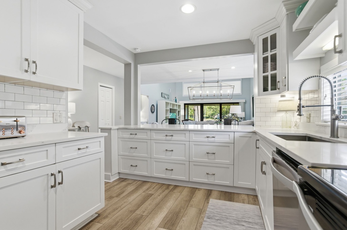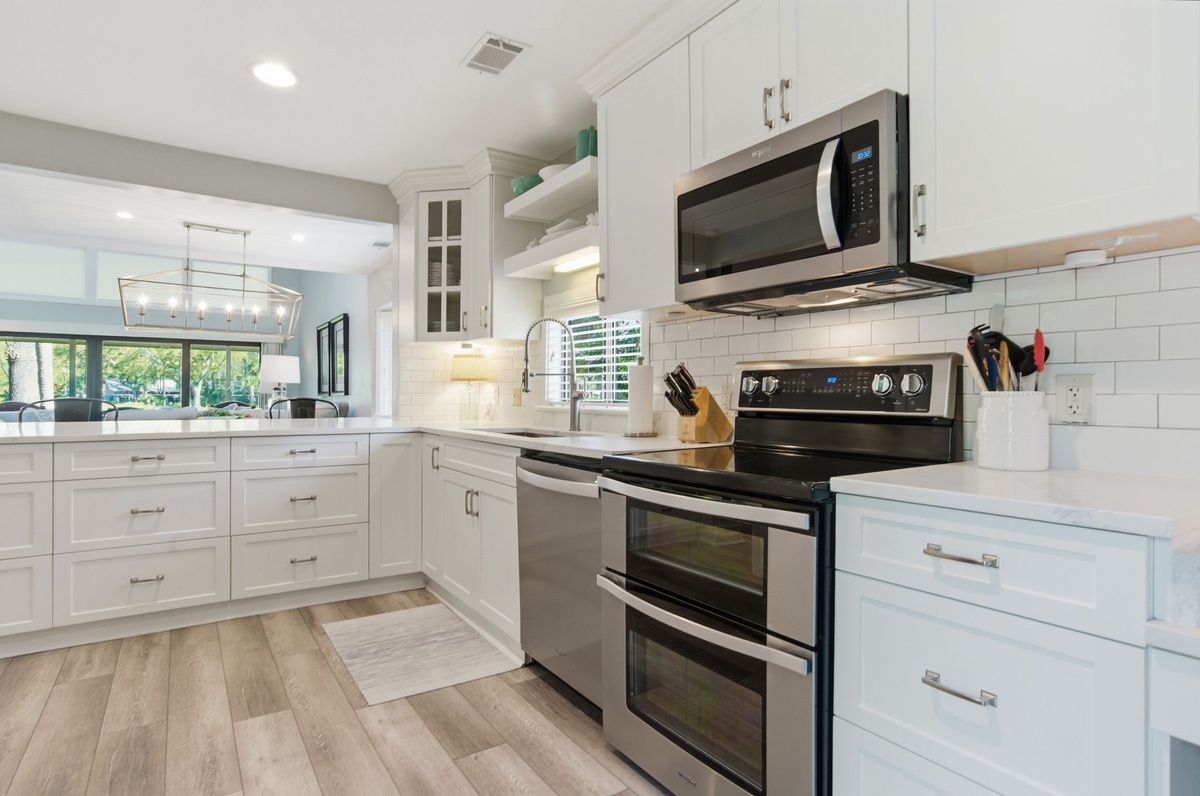 The open living space has been given a fabulous new look through upgrades and renovations to imbue a sense of modern coastal sophistication in a dazzling open floorplan. Brand new counters in the state-of-the-art kitchen highlight stainless-steel appliances and wrap through a wide passthrough to the main living space.