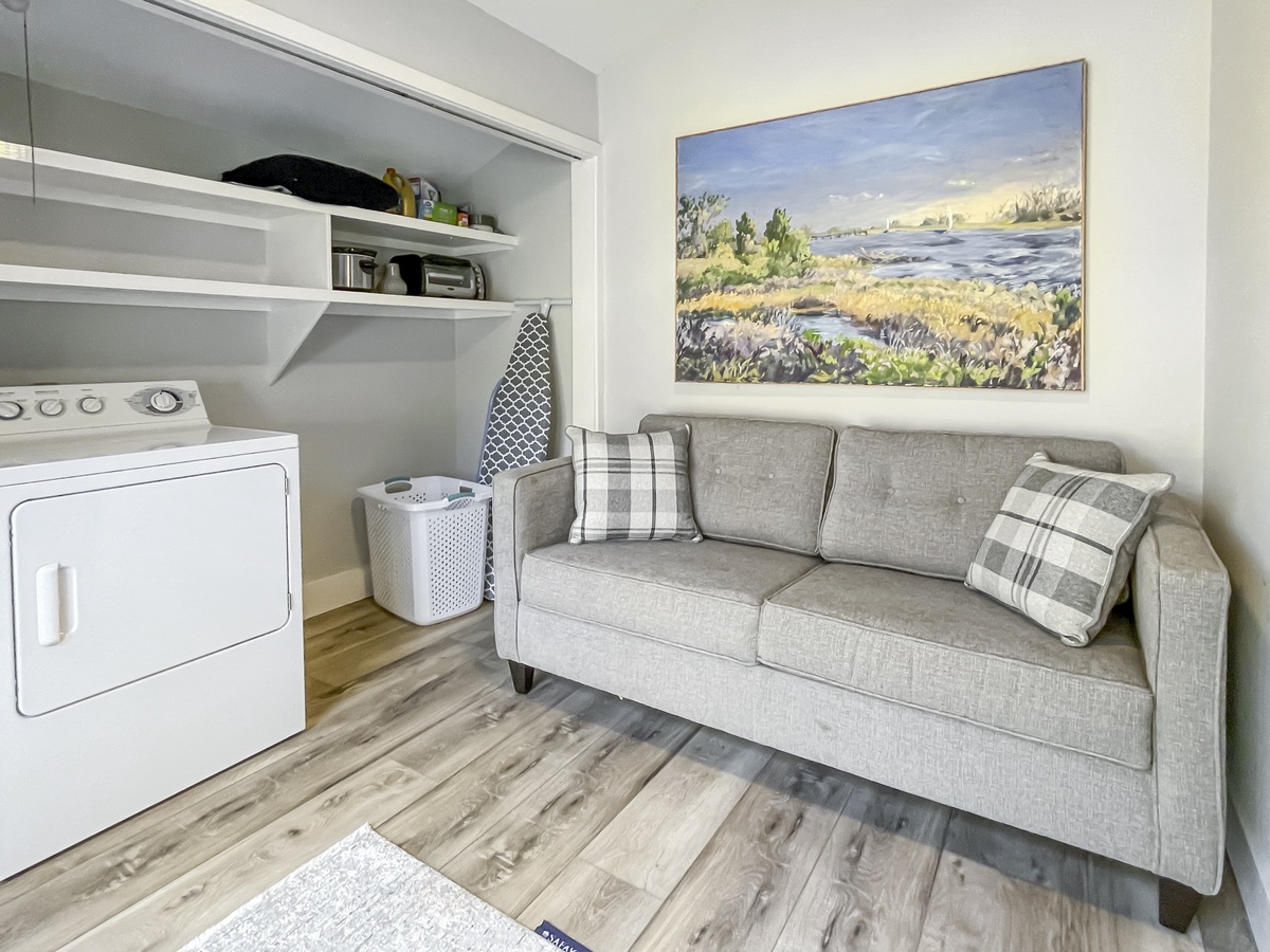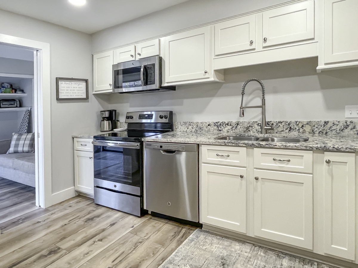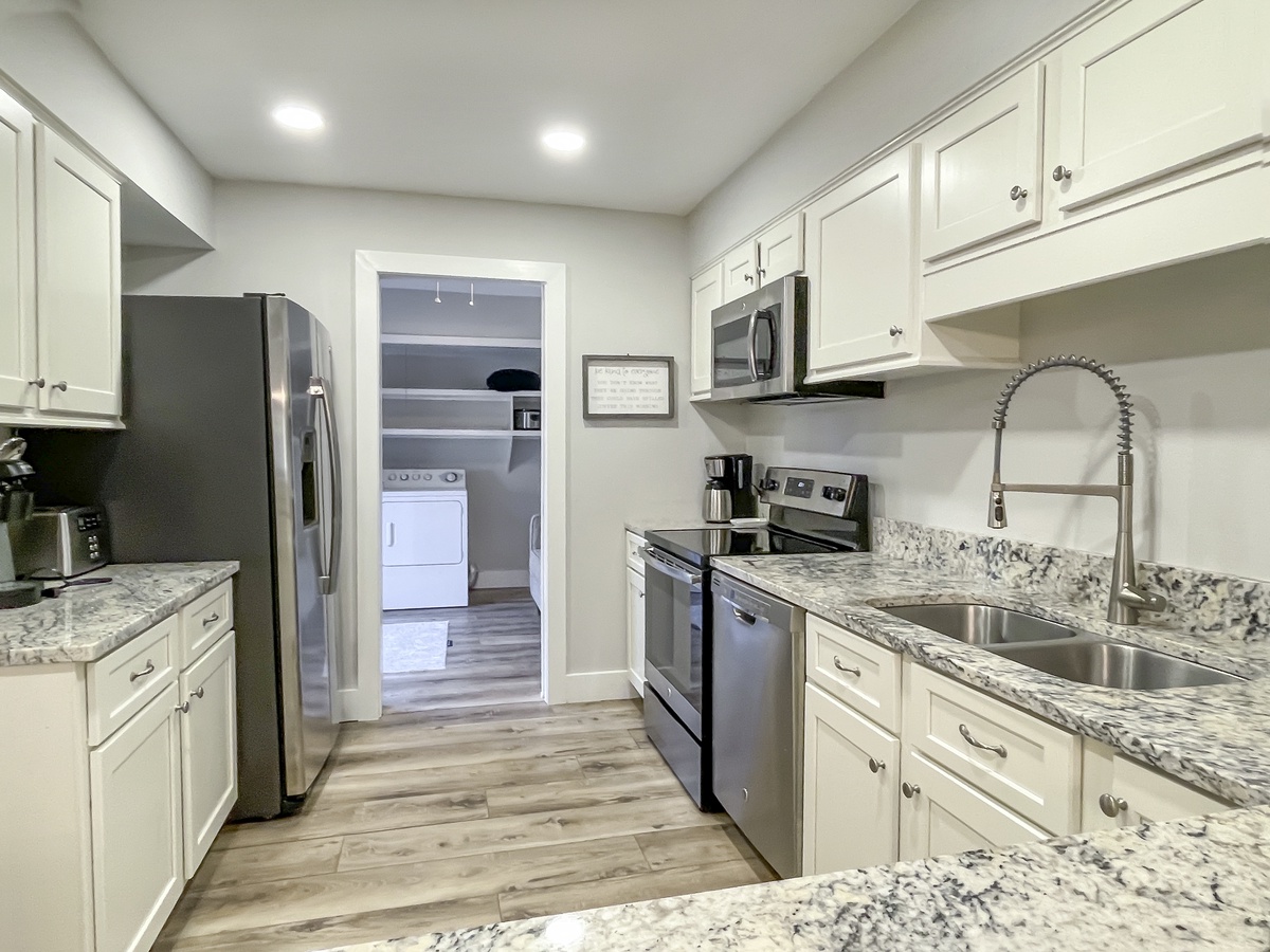 The kitchen enjoys the same open airiness and sophistication that defines the main living spaces. Open to the dining room through a granite-topped pass through, this spacious gourmet workspace boasts stainless steel appliances and everything you need to make culinary magic. A nearby laundry offers a wide footprint and a sleeper sofa.