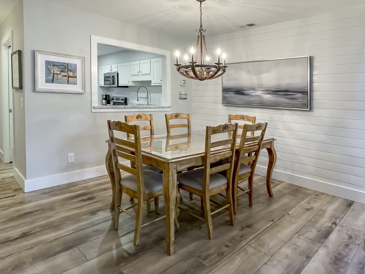 The open floor plan is infused with a coastal chic sense of style as well as lush natural light from skylights and wide windows. Passing through the dining room with its chic accent walls of shiplap and accommodations for six, we transition to the great room, where ceilings soar toward skylights. Drenched in this lush light, the living space enjoys multiple seating options with sofa and loveseat facing a large flat-screen TV and wide sliders framing beautiful views.