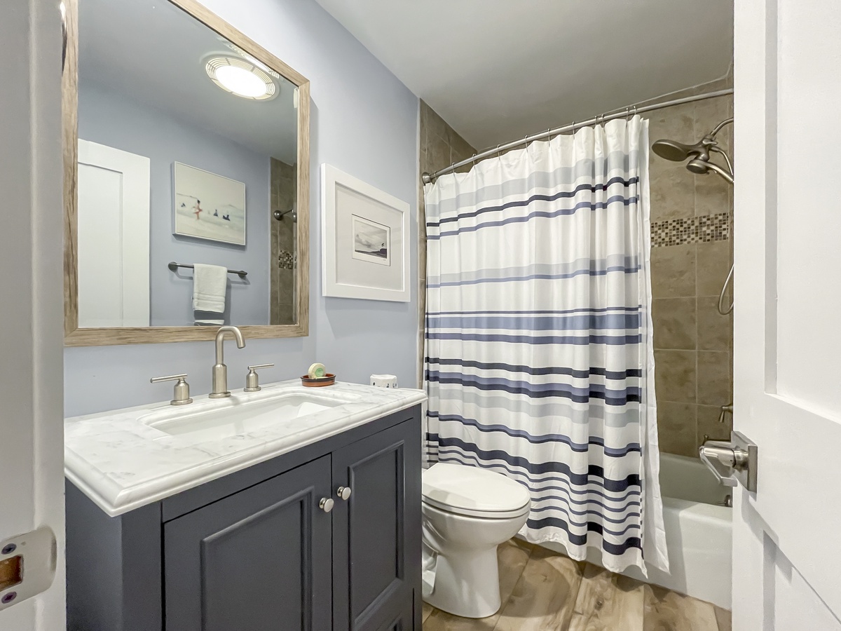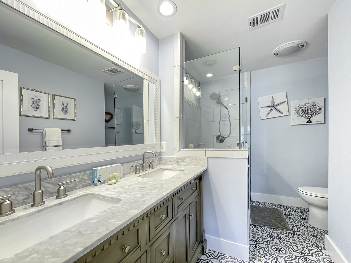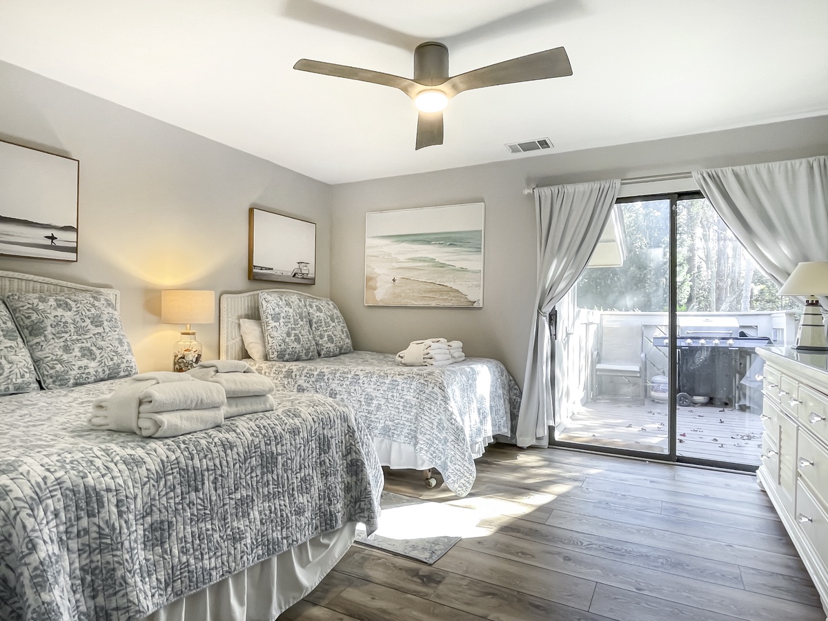 Speaking of sleep, you’ll drift off into dreams amid pure Lowcountry splendor in the dual guestrooms of this villa. In the first, a pair of double beds enjoy a space with ceiling fan, flat-screen TV and sliders which grant private access to the front patio. A nearby full bath offers a tub and shower with exquisite custom tilework.