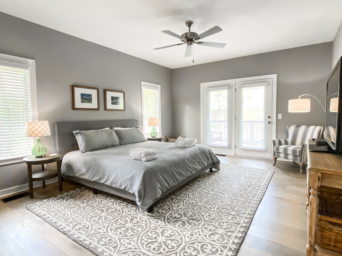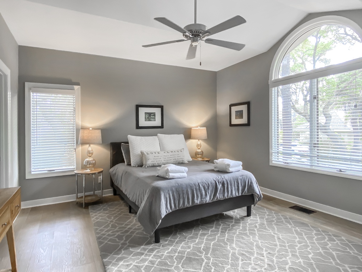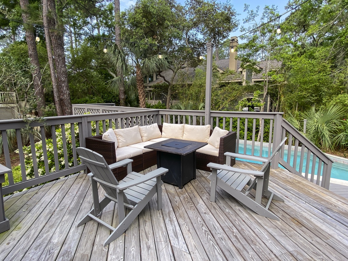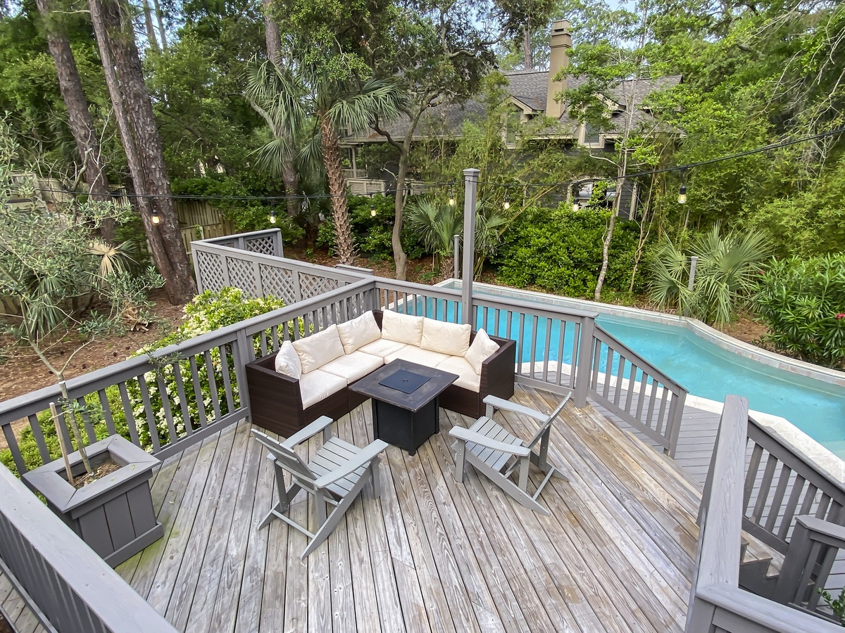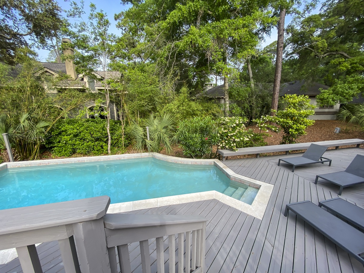 But to truly experience the wonder of the coastal south, you’ll want to take that meal on the expansive rear patio, which cascades down toward a lush garden ringed with magnolias, palms and oaks for privacy. Each tier offers its own delights – al fresco dining on the top level, tranquil firepit on the landing, and then at the bottom the spacious pool deck. Unwind in one of several chaise lounges and soak in the sun or splash in the crystalline waters of the resort-depth pool.