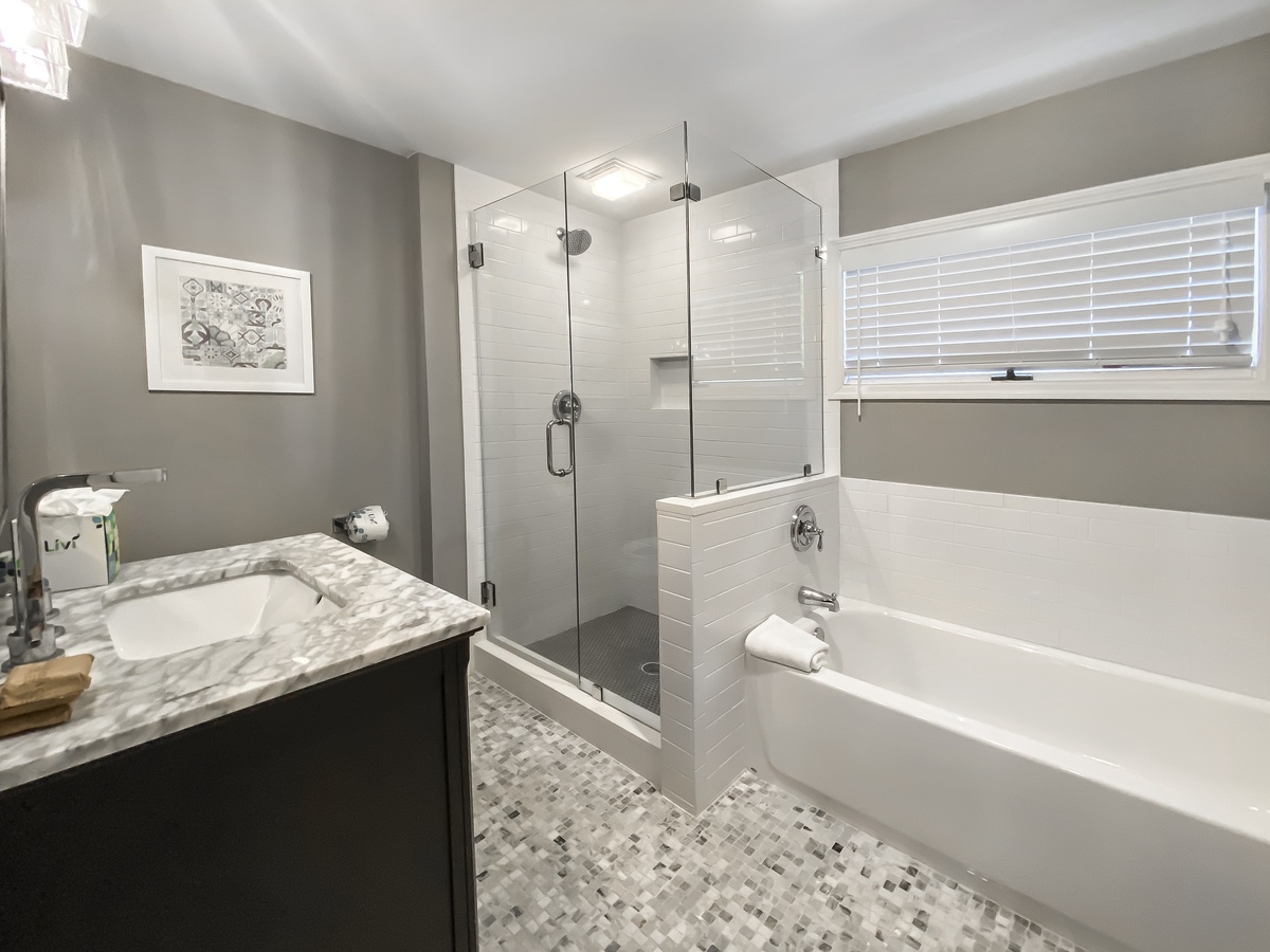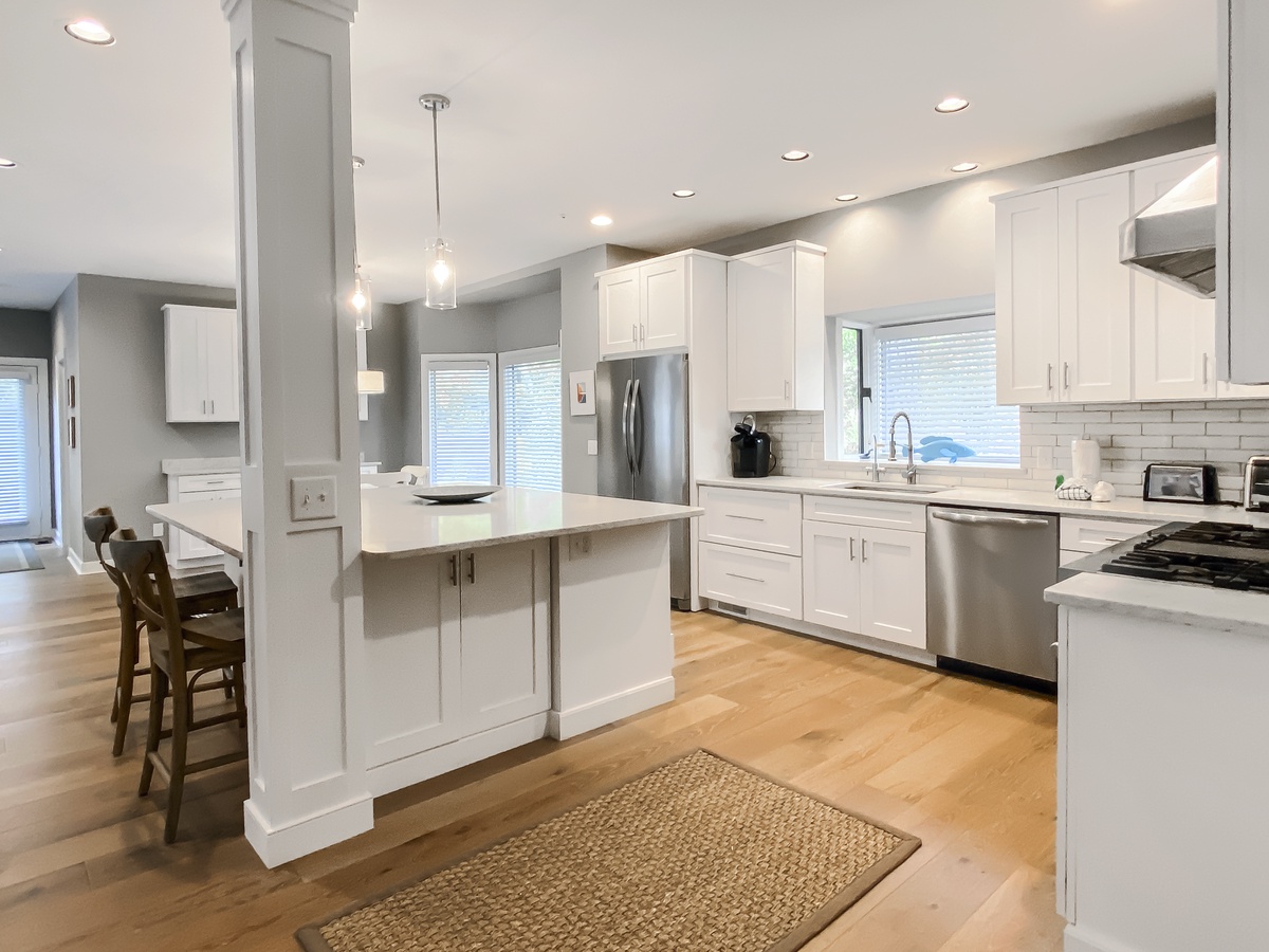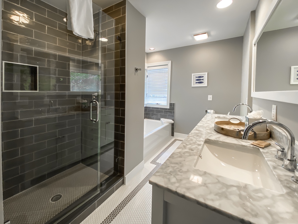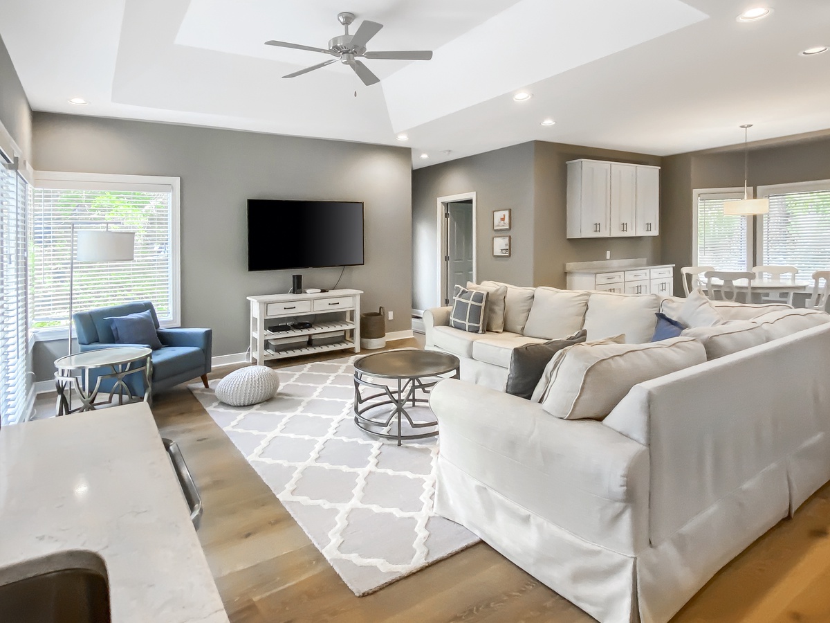 Updated with coastal elements and accent walls of shiplap, the main living spaces exult in natural light and open airiness. Greeting you upon entering, the grand living room impresses with its plush sectional sofa set before a stylish shiplap and subway tile decorative fireplace and flat-screen TV. Another more intimate gathering spot on the far end of the open living space boasts its own sectional sofa and flat-screen TV.