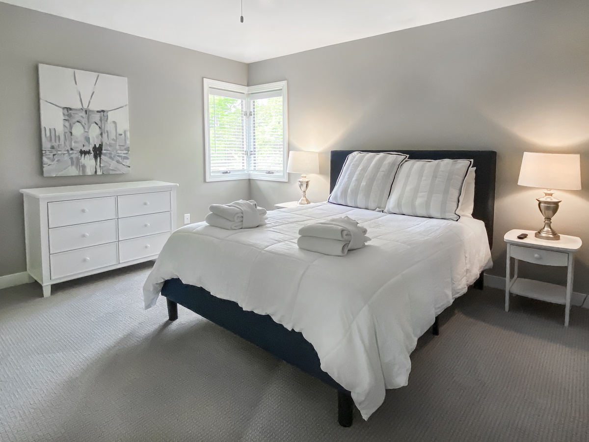 Heading back to the ground floor, we find yet another dreamy guest room with a queen bed set beneath cathedral ceilings and a luxurious en suite with massive walk-in shower.