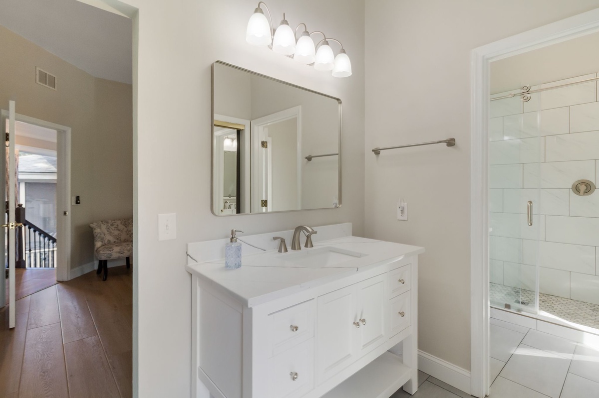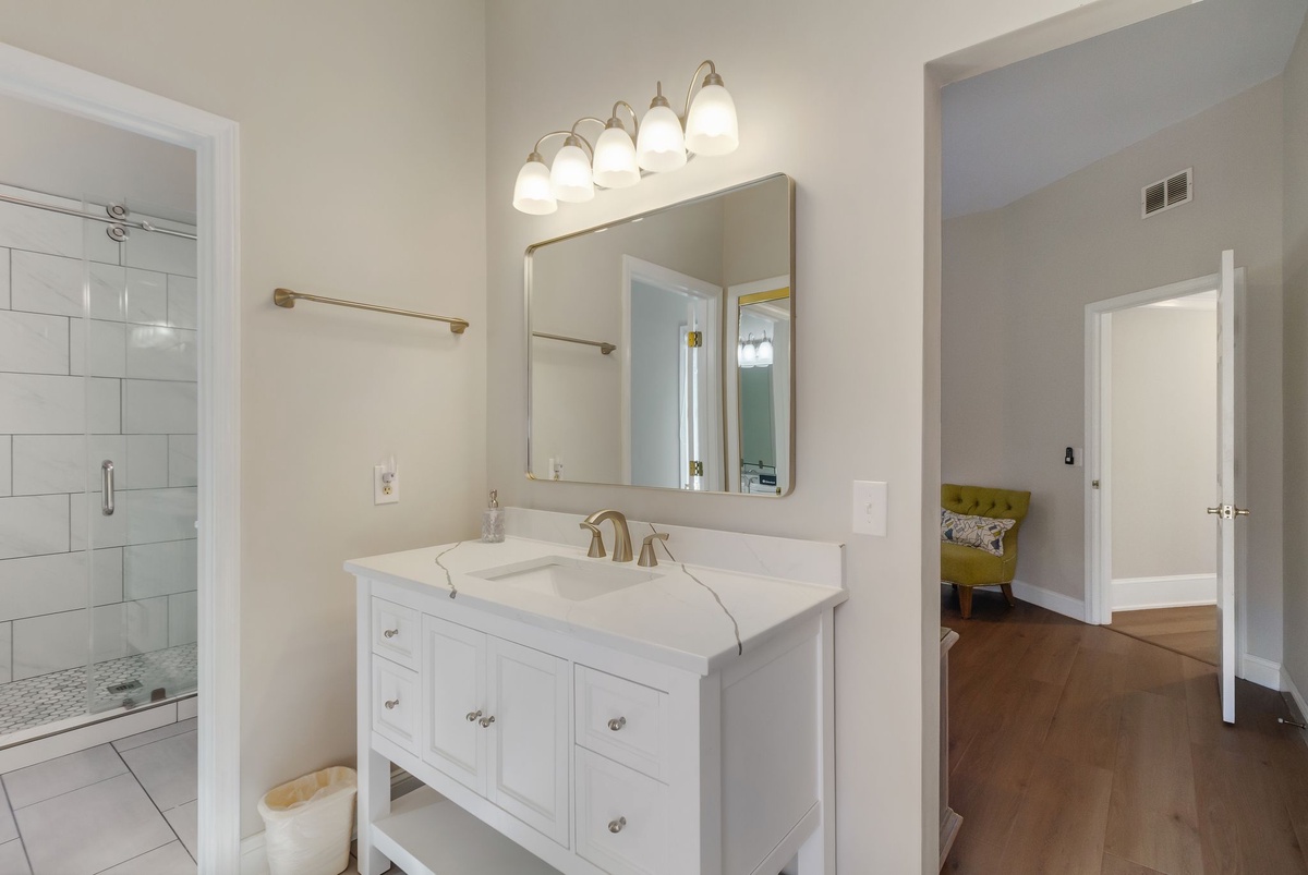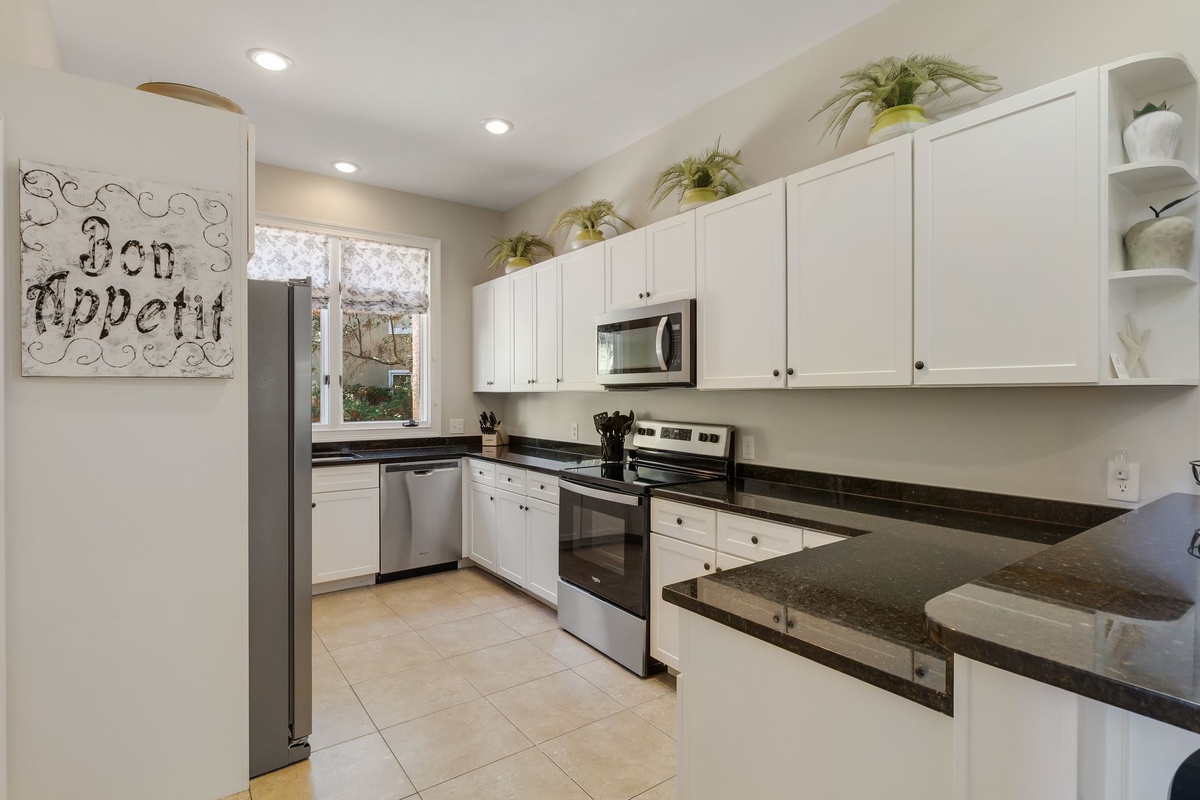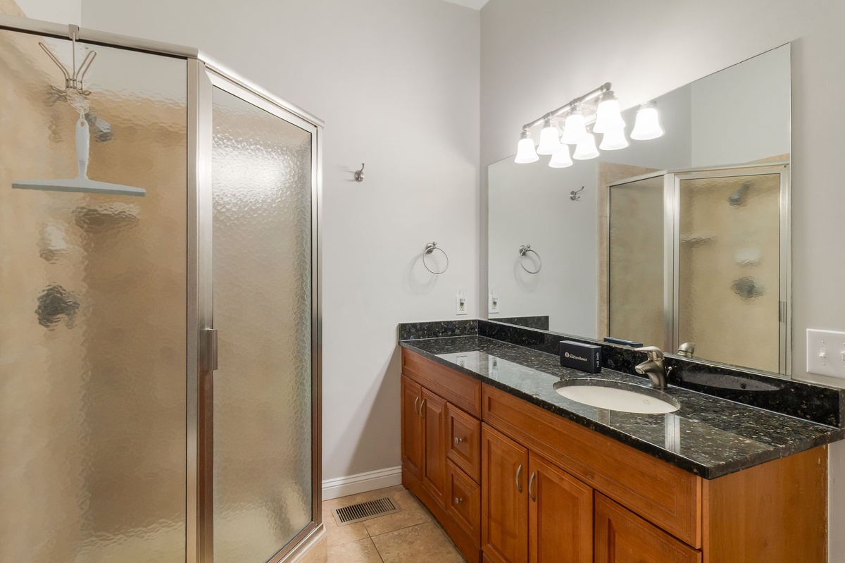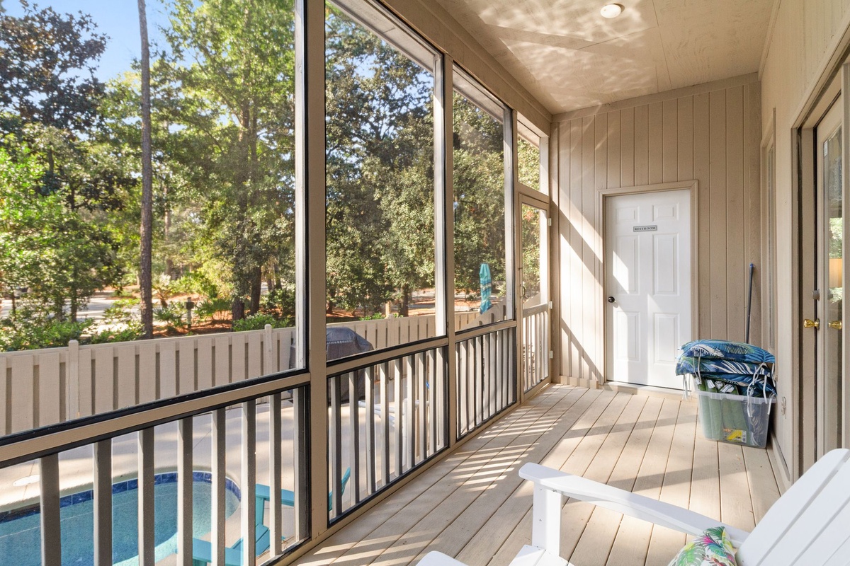 The covered back porch runs the full length of the home, offering Adirondack chairs for peaceful poolside views. Enjoy the beautiful kidney-shaped pool and spa, fire up the grill for an outdoor feast, and take advantage of the convenient half bath just outside.