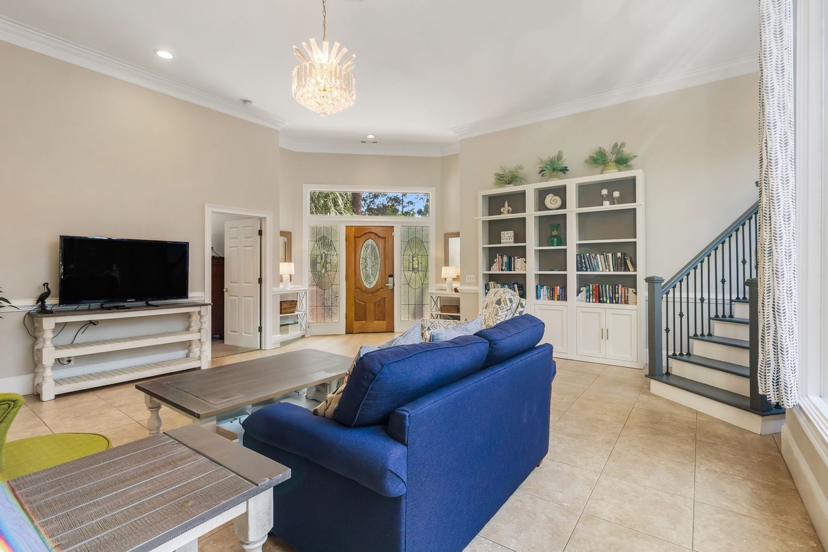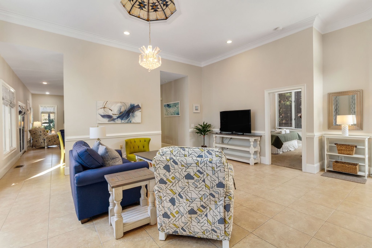 Step inside to a bright, expansive gathering space perfect for family and friends. The main living room welcomes you with a plush sofa, two side chairs, a large flat-screen TV, and views of the private pool and spa just beyond the windows.