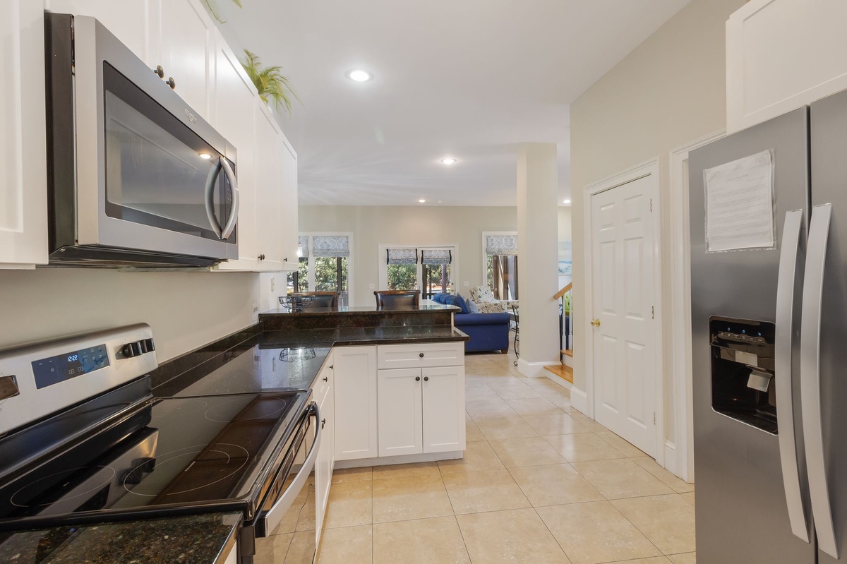 A wall separates the main living room from the open-concept den, dining area, and kitchen, designed for comfort and togetherness. The upgraded, fully equipped kitchen offers plenty of counter space for preparing family meals, while the dining table seats eight, with an additional kids’ table tucked nearby. The cozy den features two couches, a side chair, and another large flat-screen TV — perfect for relaxing while dinner simmers.
