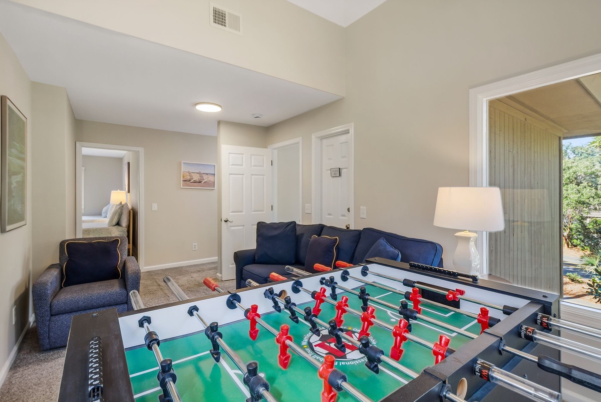 • Right Wing – Kid-Friendly Fun: Upstairs on the opposite side, you’ll find two bedrooms, each with two queen beds and en suite bathrooms, plus a flat-screen TV in every room. This wing also includes a separate game room featuring a foosball table and another TV — perfect for movie nights or friendly competitions.