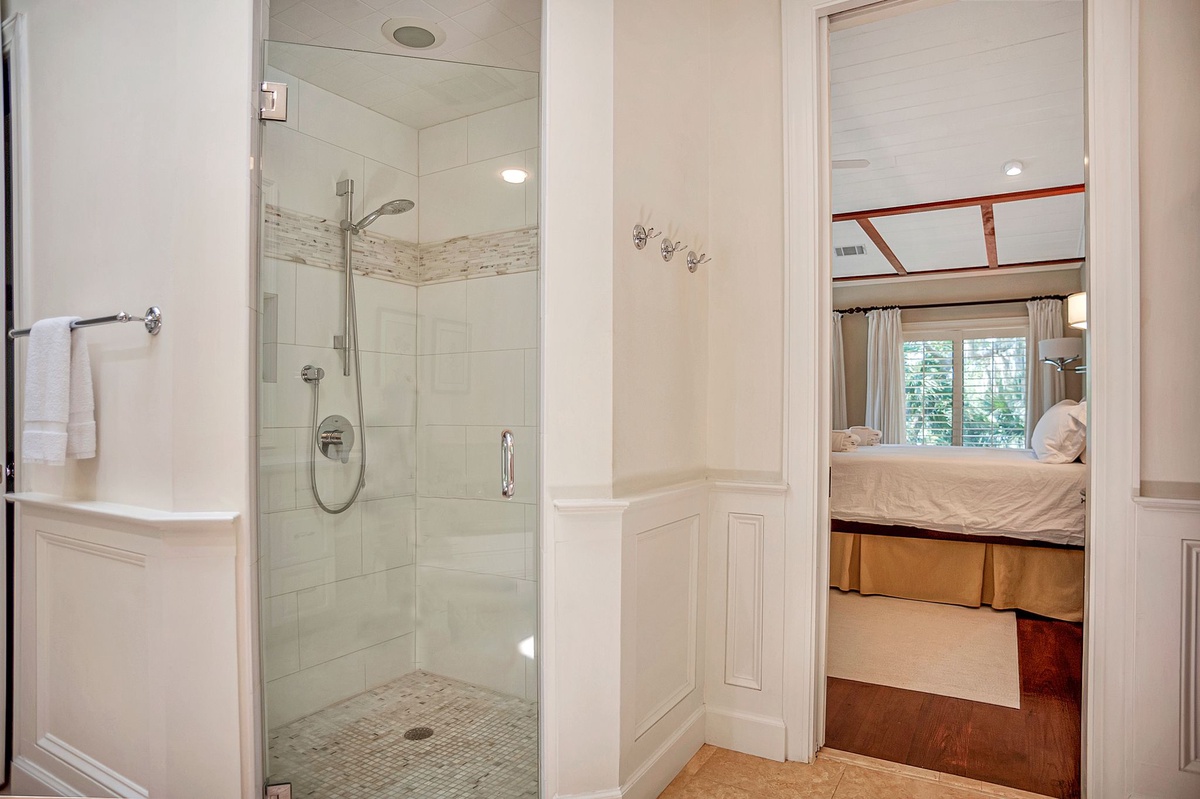 Moving along past the full laundry, we come to the first of the property’s lushly comfortable guest suites. Set behind French doors, this first suite centers on a king size bed set beneath a wide-brimmed ceiling fan, with a flat-screen TV and en suite bath with tub and shower rounding out the comforts.