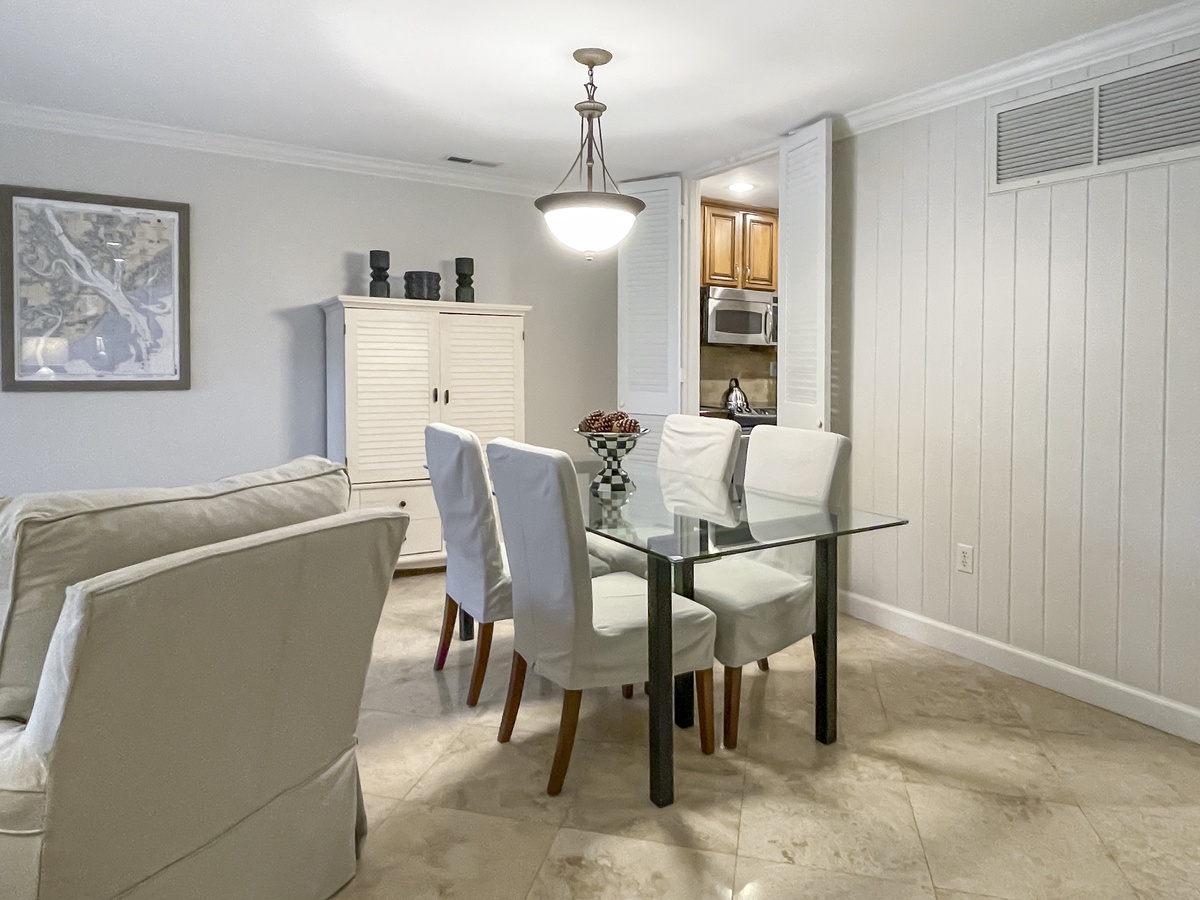 You can enjoy a panoramic view of this bucolic splendor in the beautifully opened Carolina room, where a gaming table for four and sleeper sofa gaze out on gently rippling lagoon waters, twisting live oaks and stately red cedars.
