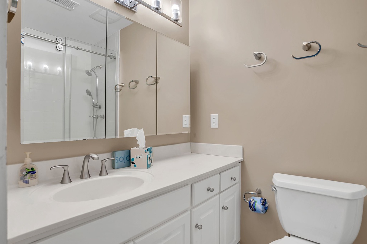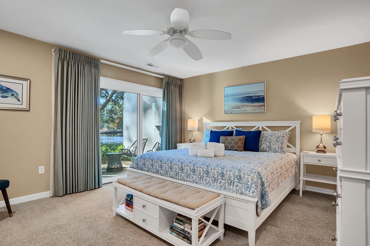 Two beds encapsulate the coastal comfort that defines this villa. The master pairs neutral walls against a calming, nautical blue and white set of linens on a roomy king-size bed. This suite enjoys spacious closets, a wall-mounted flat-screen TV and private bath boasting wide countertops on a single basin vanity, plus a walk-in shower with dual showerheads. Step through sliding glass doors, and you’re enjoying the beautiful lagoon views from the master suite’s private wooden deck.