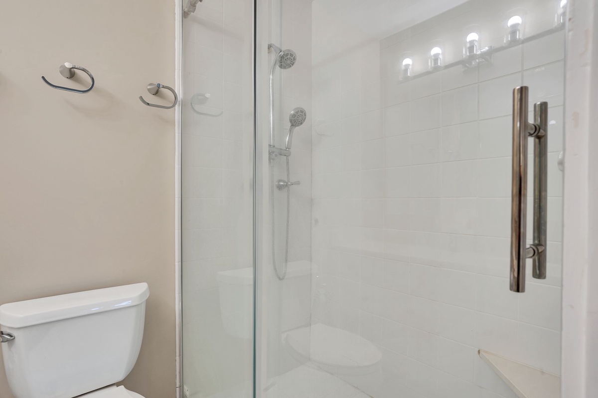 A second bedroom wraps a plush queen-size bed in a spacious hideaway featuring sliding glass doors leading to a cozy space out front, plus an en suite with single basin vanity and walk-in shower with dual showerheads.