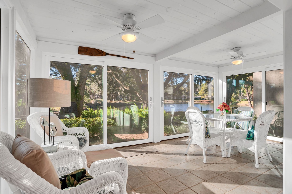 Light and airy, with rustic touches reminiscent of beachside cottage, this two-bedroom vacation villa offers a relaxing getaway with easy access to some of the most exciting amenities in Sea Pines.