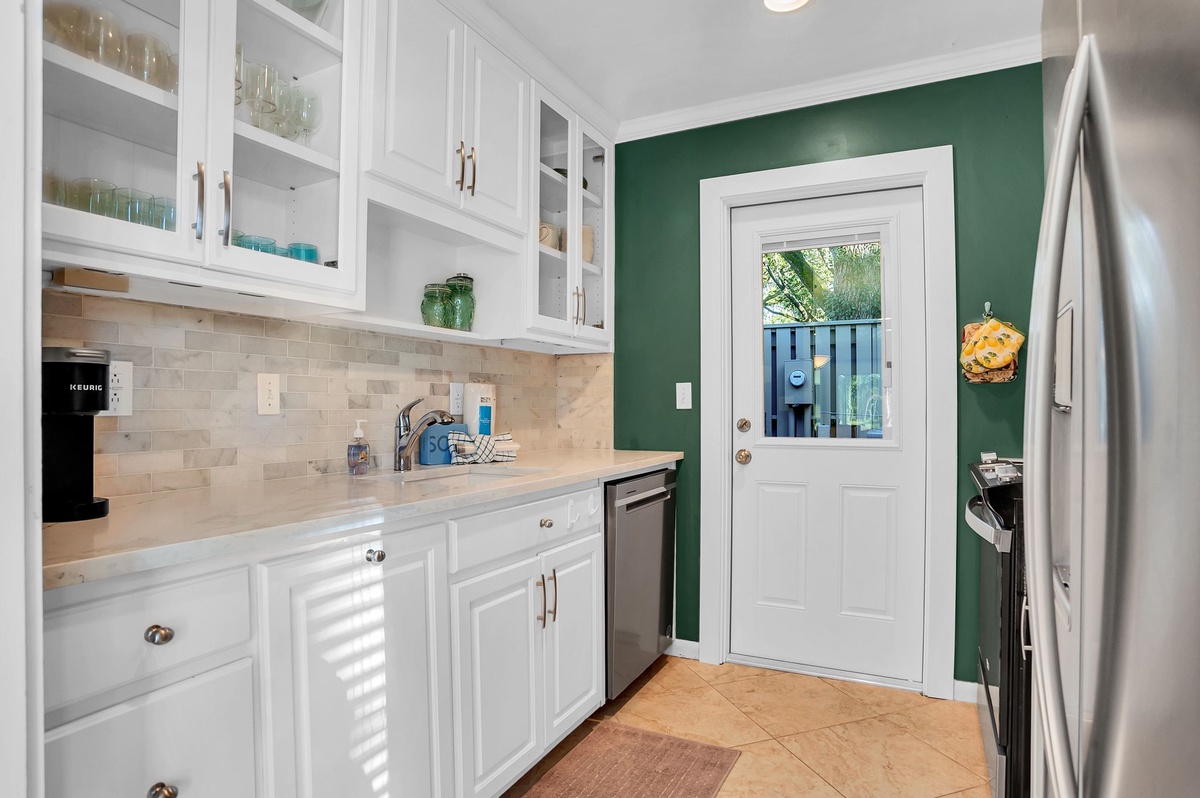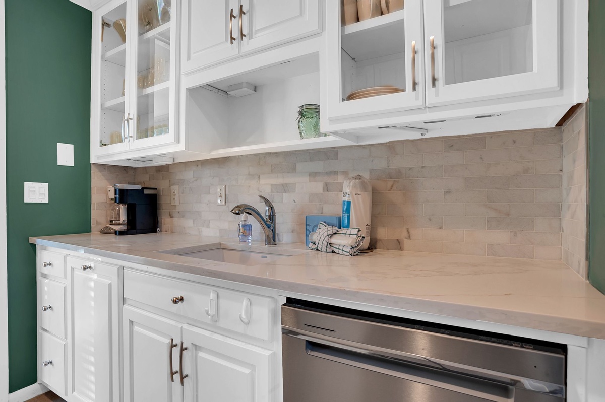 Speaking of cooking, the attractive galley kitchen inside contrasts clean white glass-fronted cabinets and tiled backsplash against quartz countertops. Dining can be found convenient to the kitchen at a wide butcherblock table with seating for six.