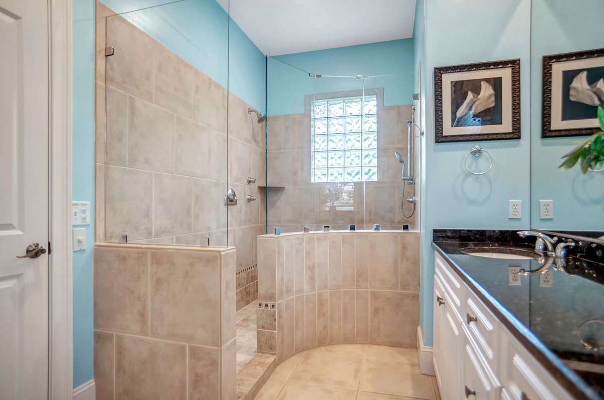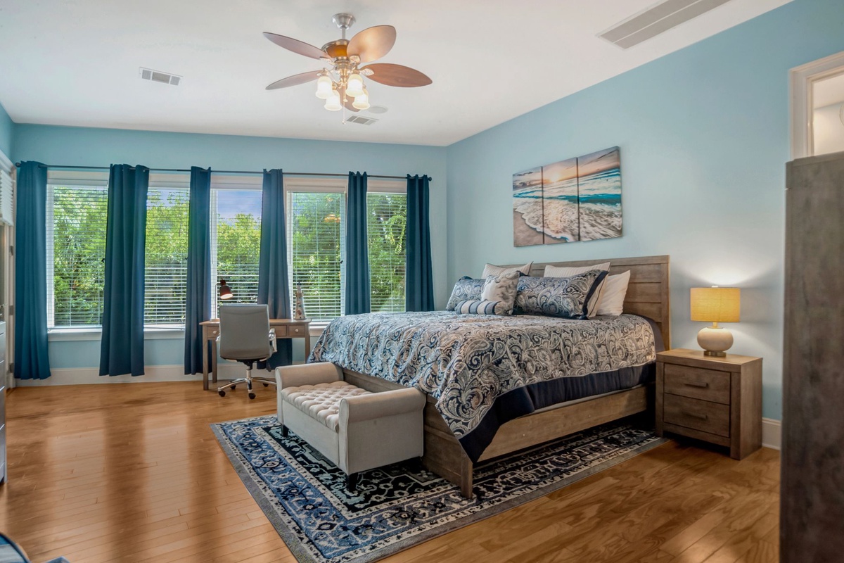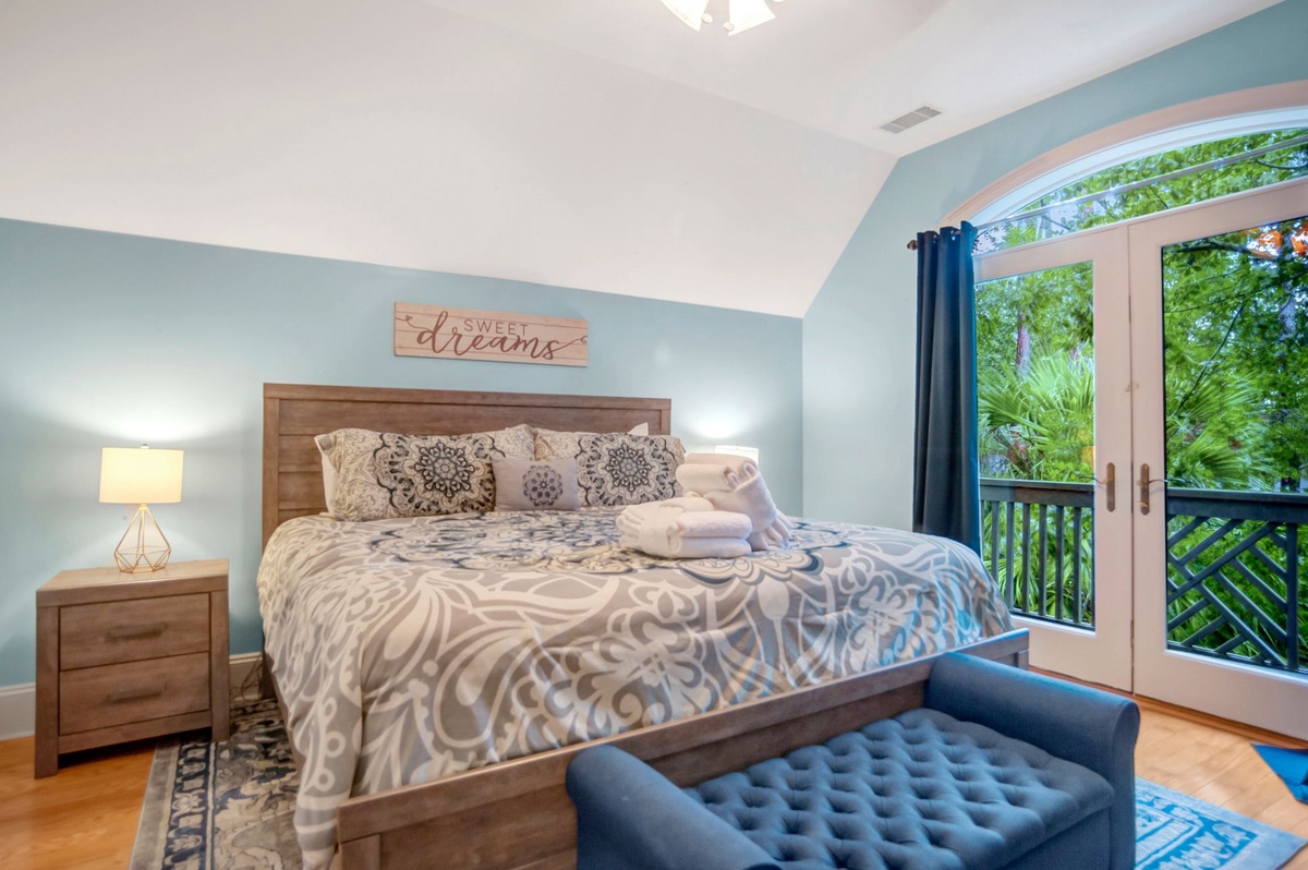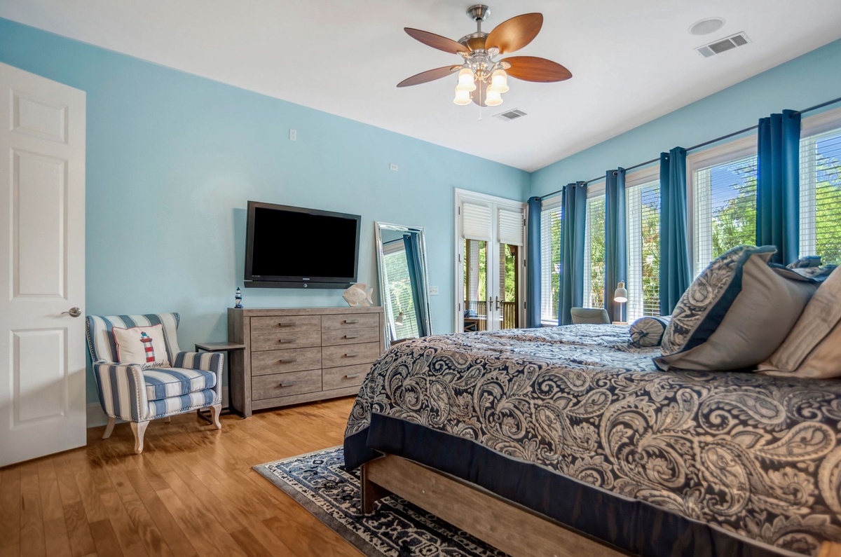 Four guest rooms continue the motif of exquisite Lowcountry living amid marvelously updated surroundings. The first of three on the ground floor could function as a master, with its sprawling king-size bed set beneath a ceiling fan with private access to the back patio and spacious en suite with dual-basin vanity and expansive walk-in shower set in glass bricks and offering dual showerheads.
