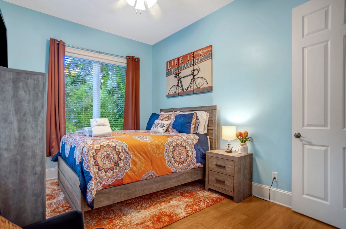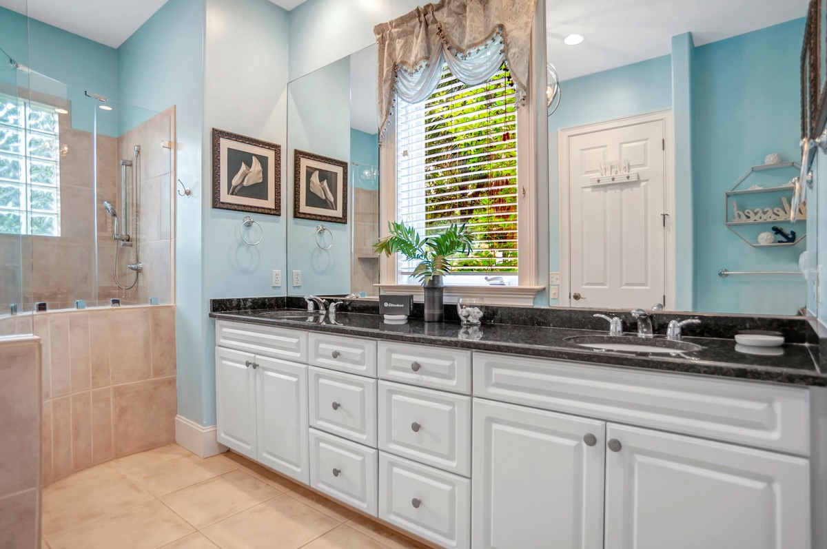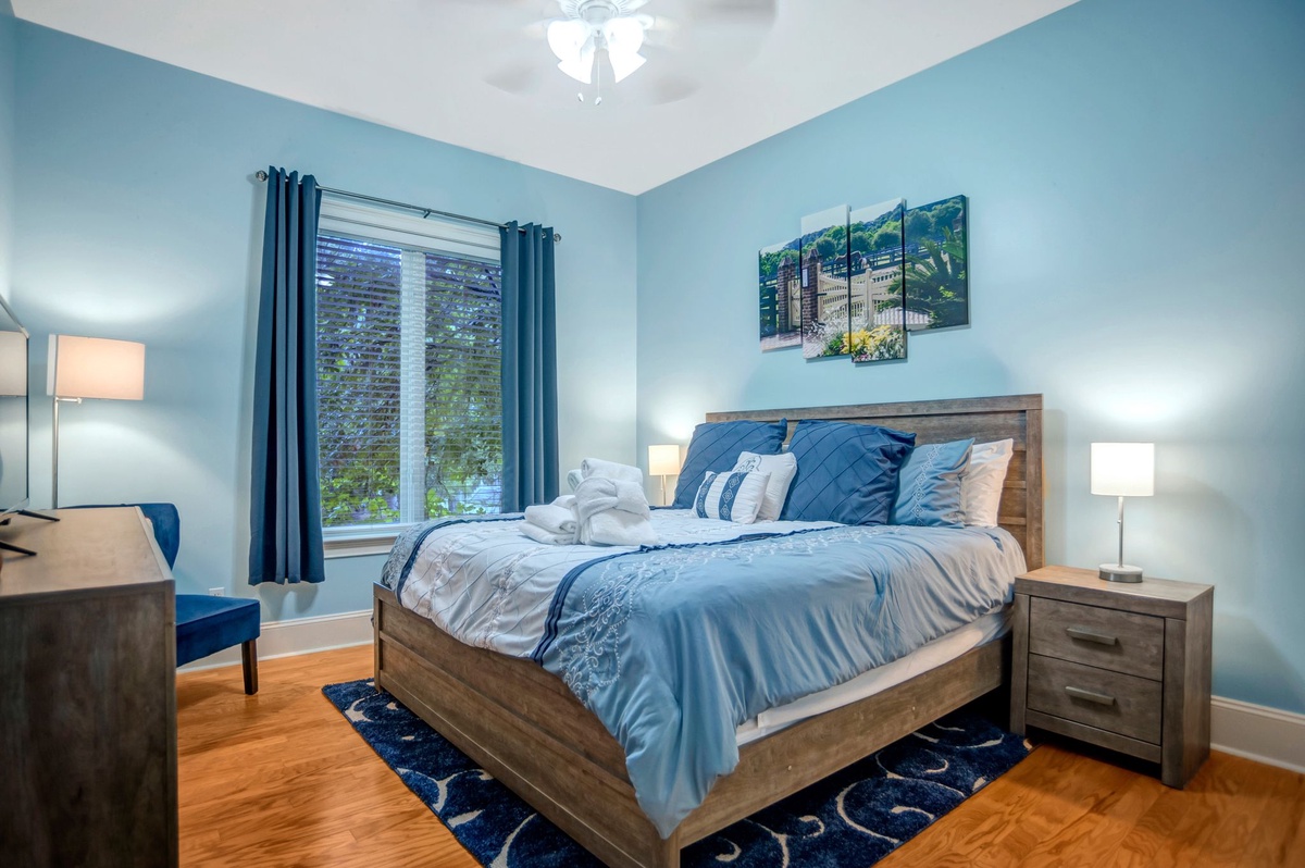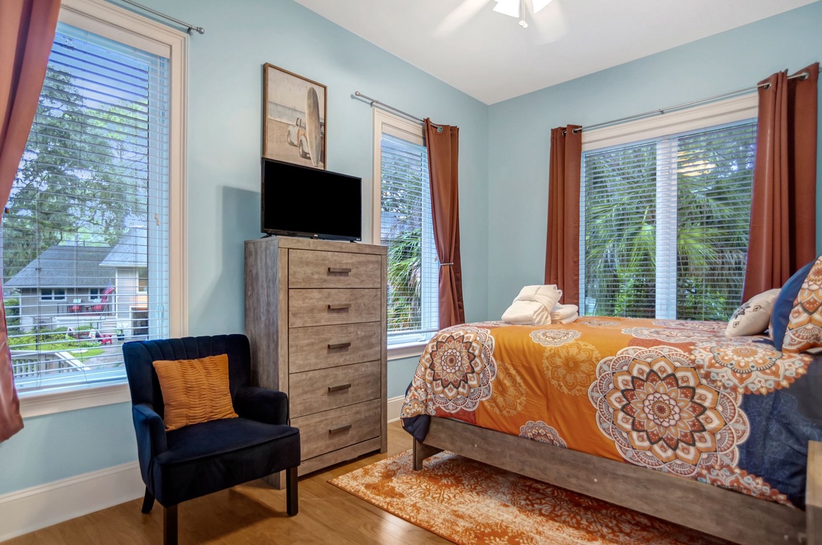 Passing by the full-size laundry with washer and dryer, we come to another pair of bedrooms, which share access to a full bath with spacious corner walk-in shower. In the first we find a queen bed in a space with a flat-screen TV. In the second, a king bed with flat-screen TV and ceiling fan.