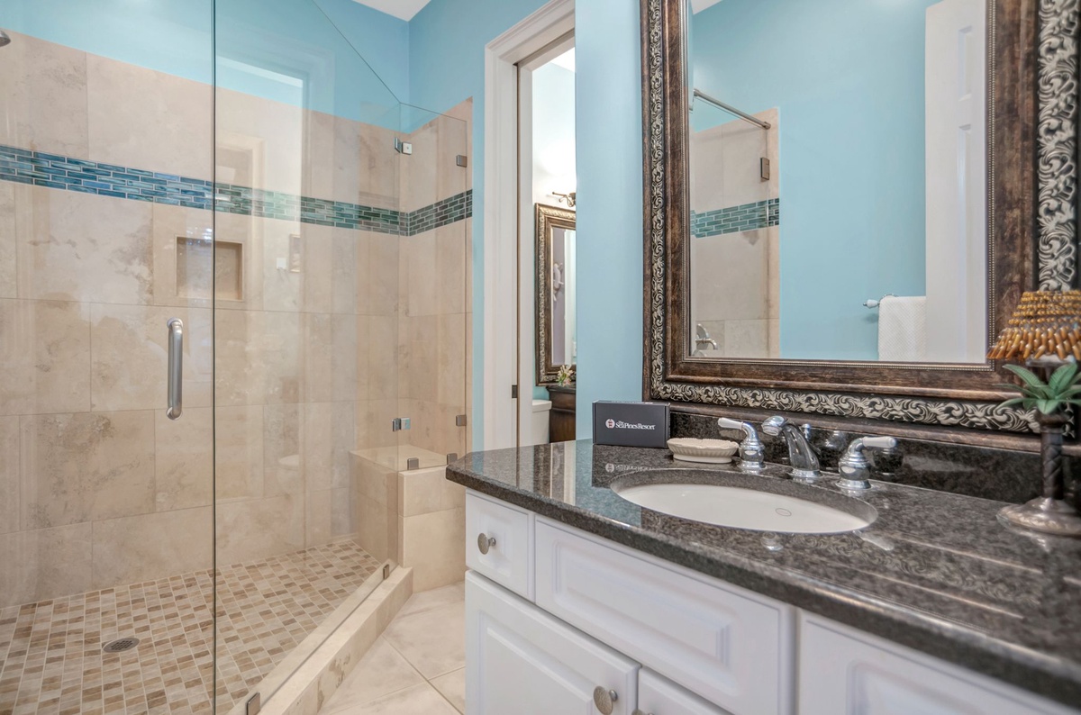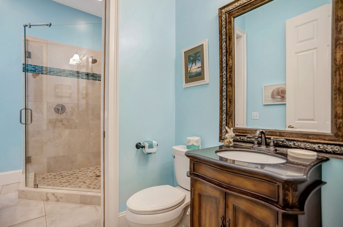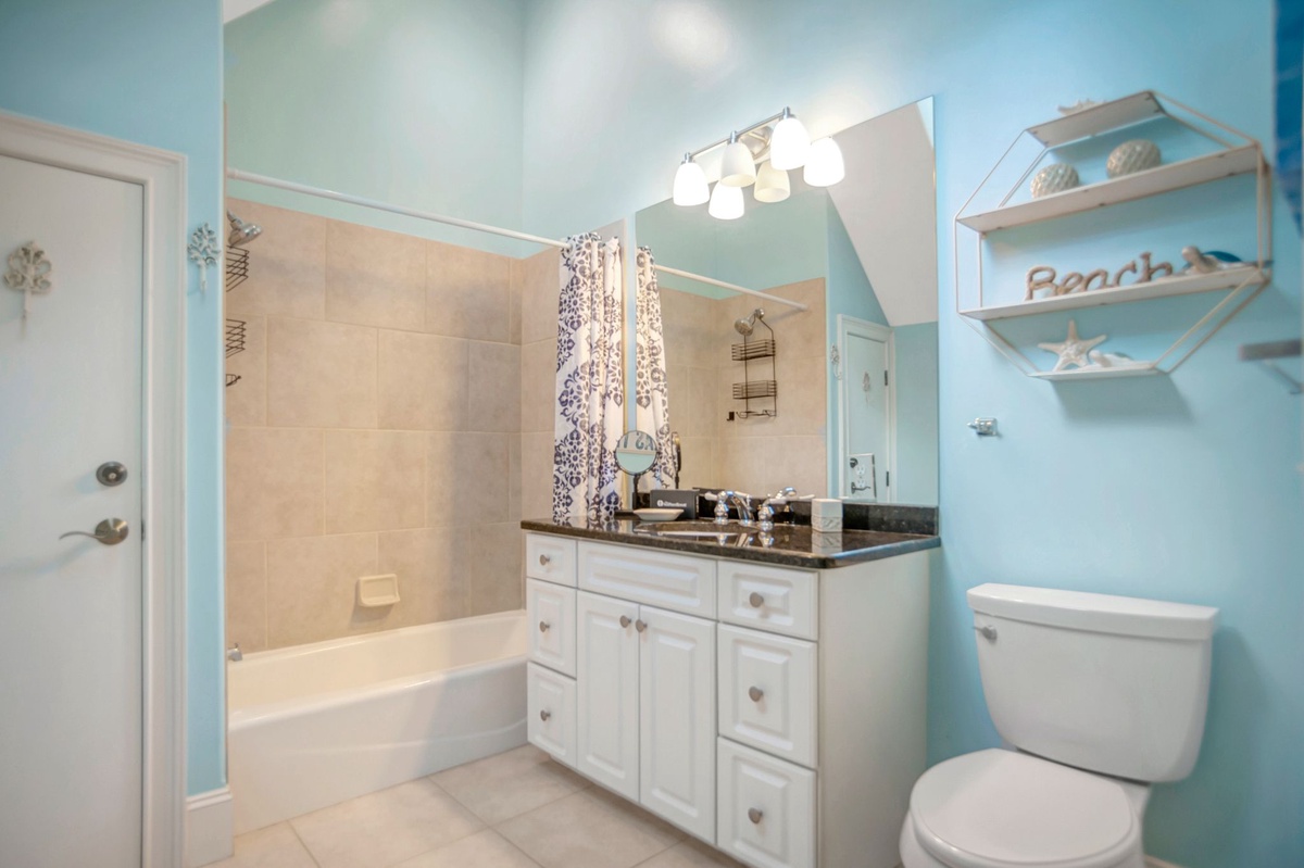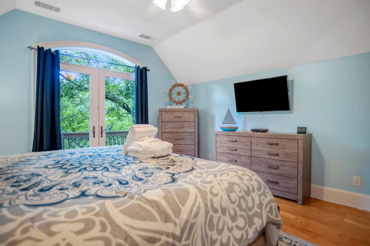 Passing by the full-size laundry with washer and dryer, we come to another pair of bedrooms, which share access to a full bath with spacious corner walk-in shower. In the first we find a queen bed in a space with a flat-screen TV. In the second, a king bed with flat-screen TV and ceiling fan.