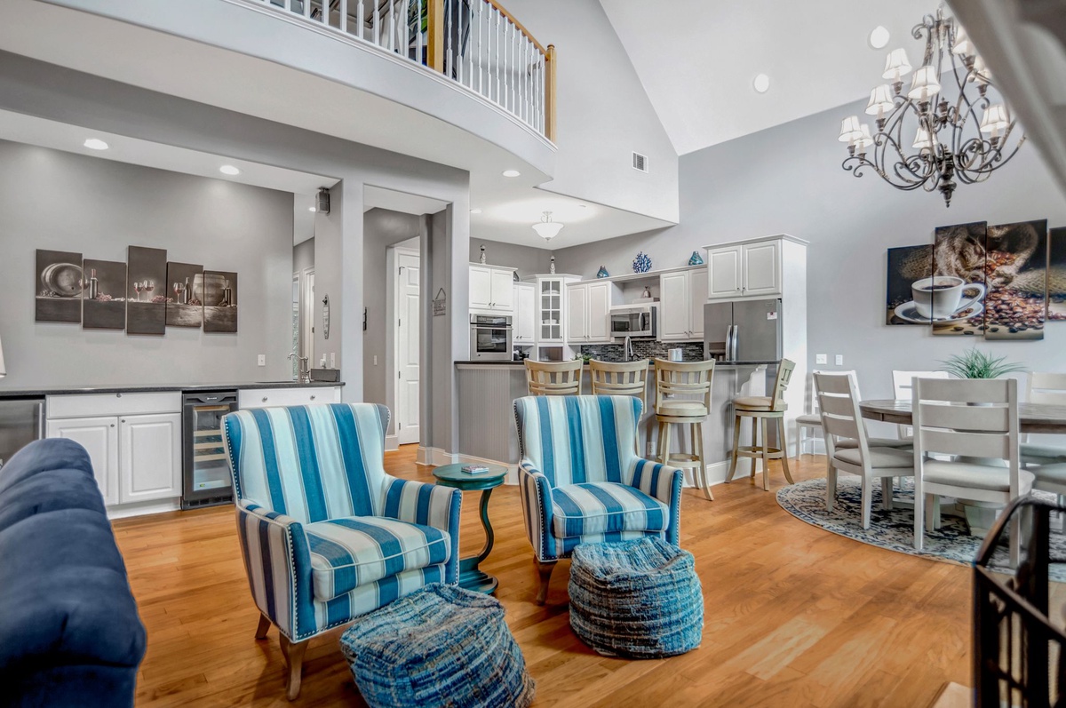 At the heart of this property you’ll find the soaring open living space, marked by gorgeous natural light flowing in from two stories of windows that stretch to cathedral ceilings. To one side, a sleeper sofa and loveseat face a massive flat-screen TV, while behind that two plush armchairs front the soaring decorative fireplace. The dining area offers seating for six in the round beneath an ornate chandelier beside the ingenious open wet bar. This wide slab of polished granite is a free-standing hub for entertaining, with sink, wine cooler and minifridge.