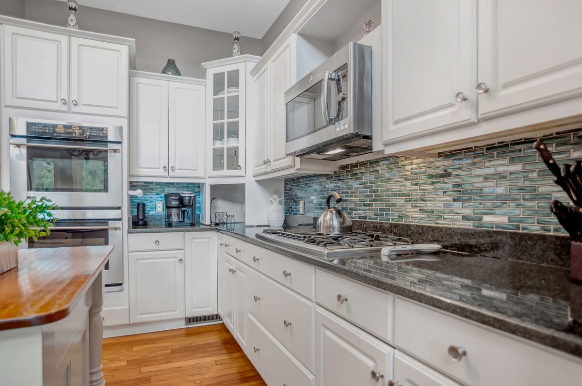 Stretching out into the open living space, a wide counter of granite offers bar seating for four while guiding you into the expansive gourmet kitchen. Here you’ll find everything you need to create an epicurean masterpiece, including five-burner chef’s range, dual ovens and a wide center island for extra workspace.