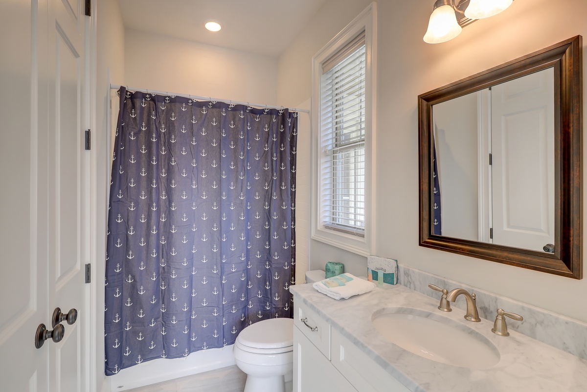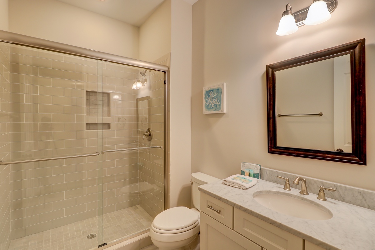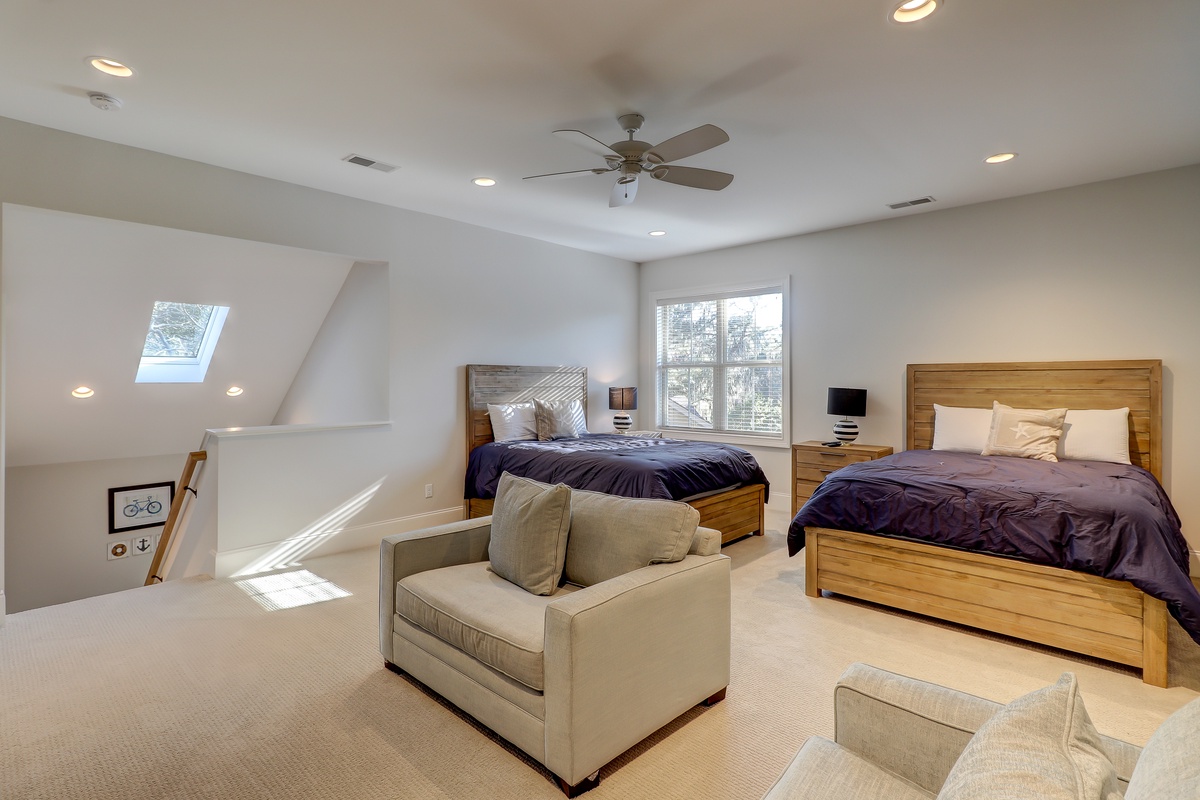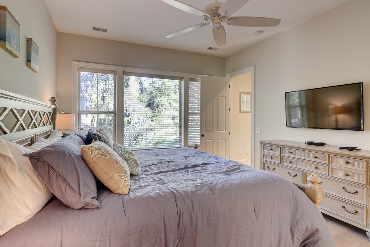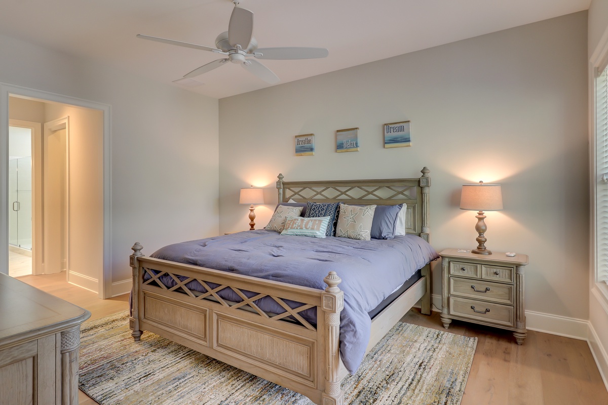 Each of the property’s four bedrooms carry the theme of Lowcountry elegance, starting with the master suite. Elegantly appointed in coastal chic décor, this resort-caliber room offers a full king bed, remote-control ceiling fan and jaw-dropping en suite with skylights and cavernous walk-in shower.